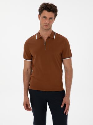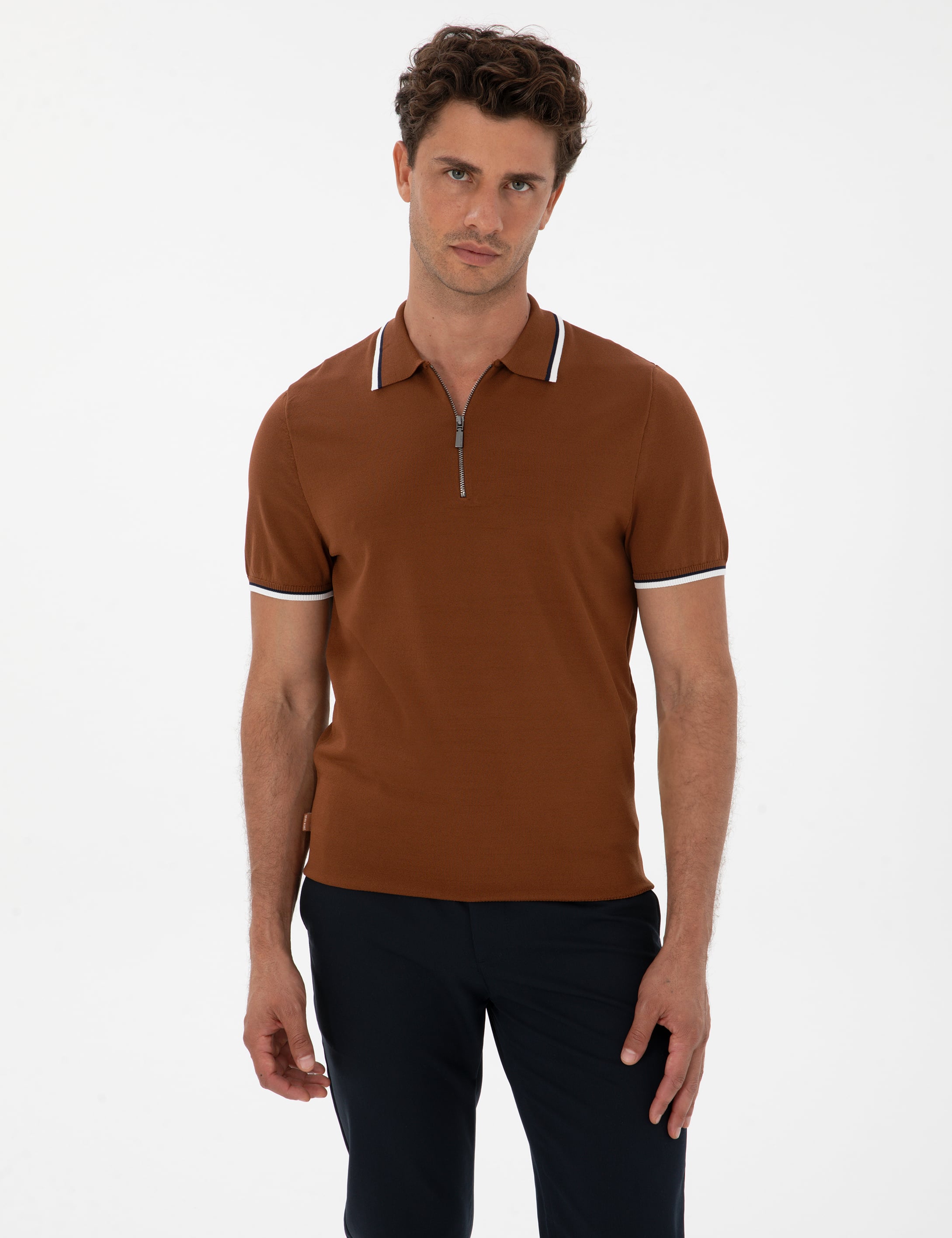 Kahverengi Slim Fit Polo Yaka Fermuarlı Triko Kazak