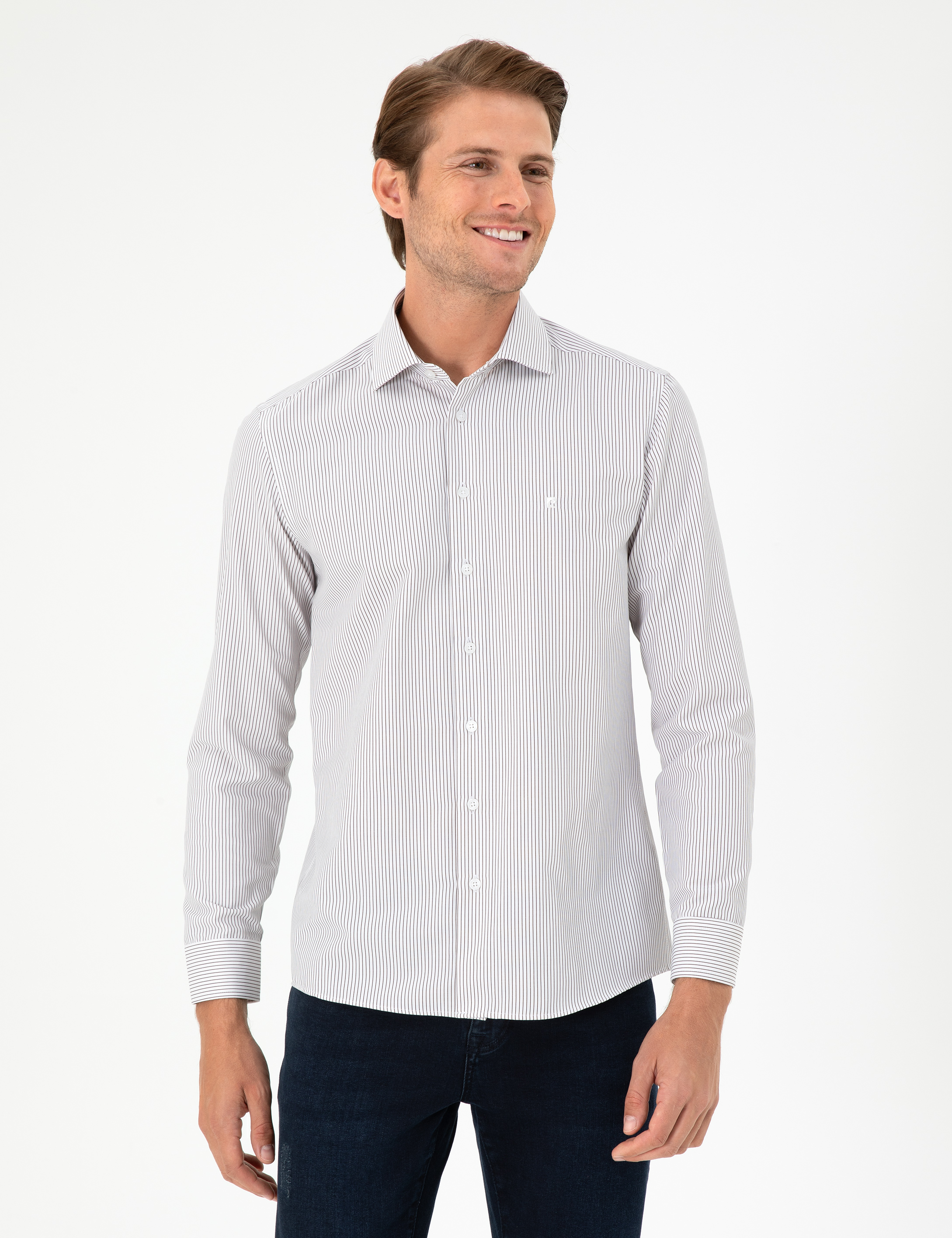 - Kahverengi Çizgili Slim Fit Uzun Kollu Gömlek