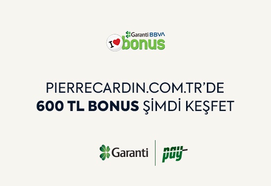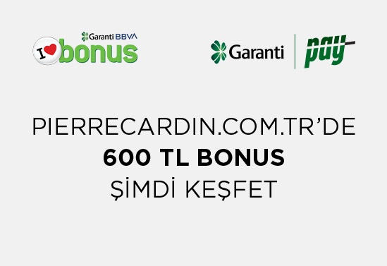 •Kampanya kapsamında www.pierrecardin.com.tr ‘de, Bonus kredi kartları ile tek seferde, peşin veya taksitli 7.000 TL ve üzeri alışveriş yaparak ödemeyi GarantiPay ile tamamlayan müşteriler, 600 TL bonus kazanacaktır.
