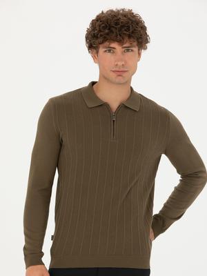 - Koyu Haki Slim Fit Fermuarlı Polo Yaka Triko Kazak