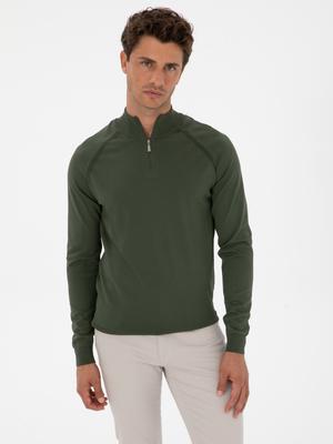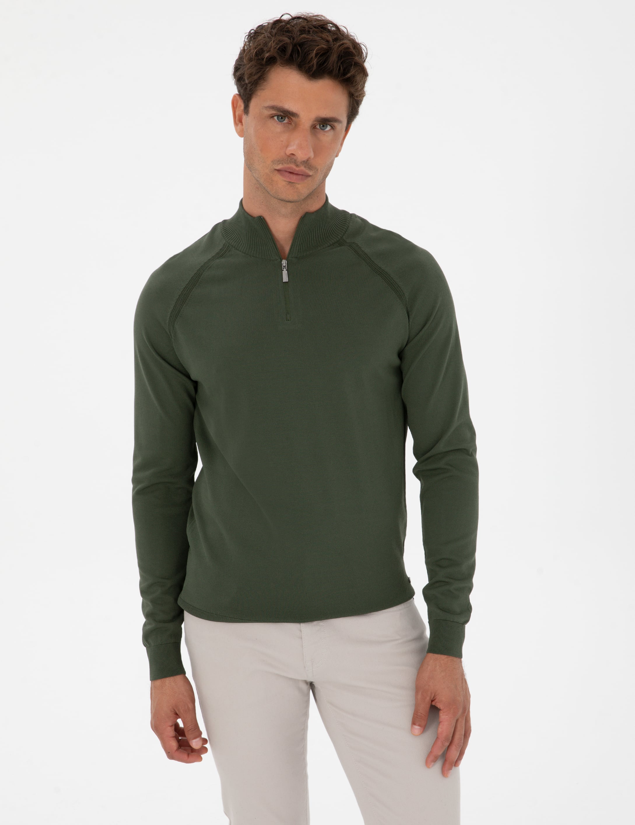 - Koyu Haki Slim Fit Dik Yaka Fermuarlı Triko Kazak