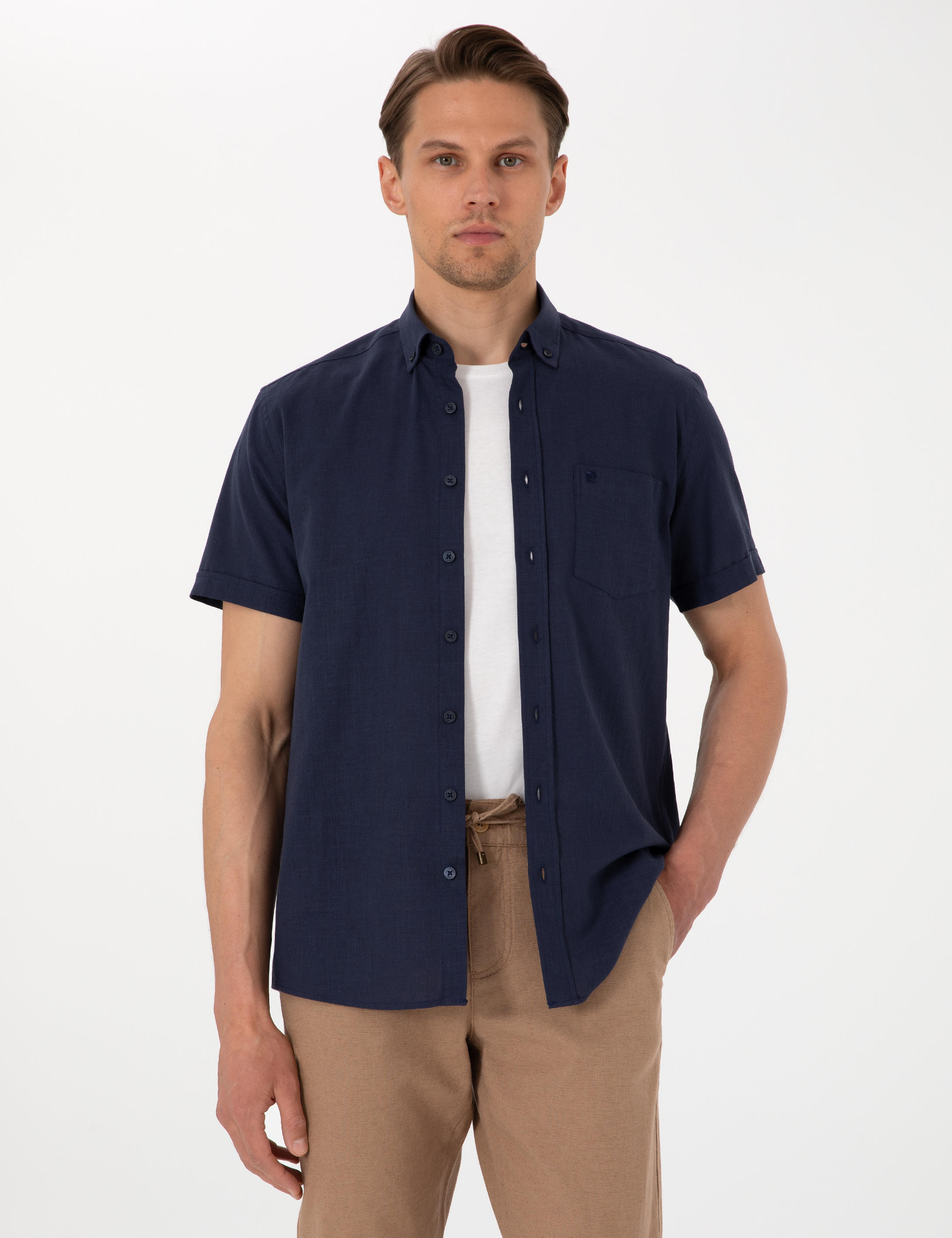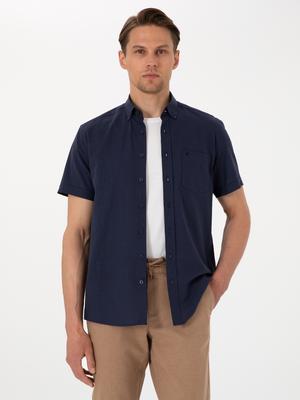 Koyu Lacivert Keten Görünümlü Regular Fit Kısa Kollu Cepli Gömlek