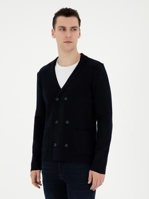 Koyu Lacivert Slim Fit Yün Karışımlı Düğmeli Triko Hırka