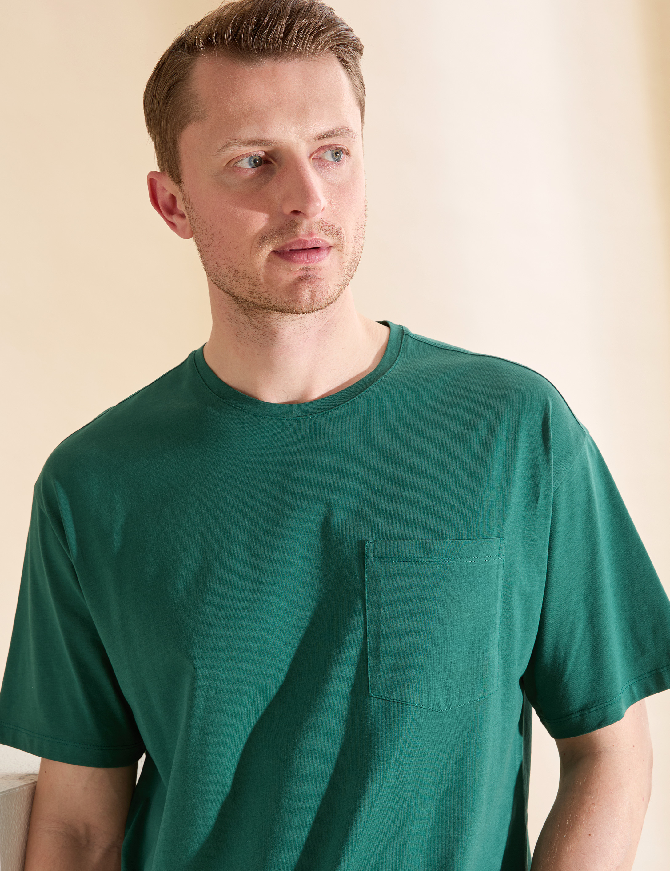 Koyu Yeşil Comfort Fit %100 Pamuk Bisiklet Yaka Basic Tişört