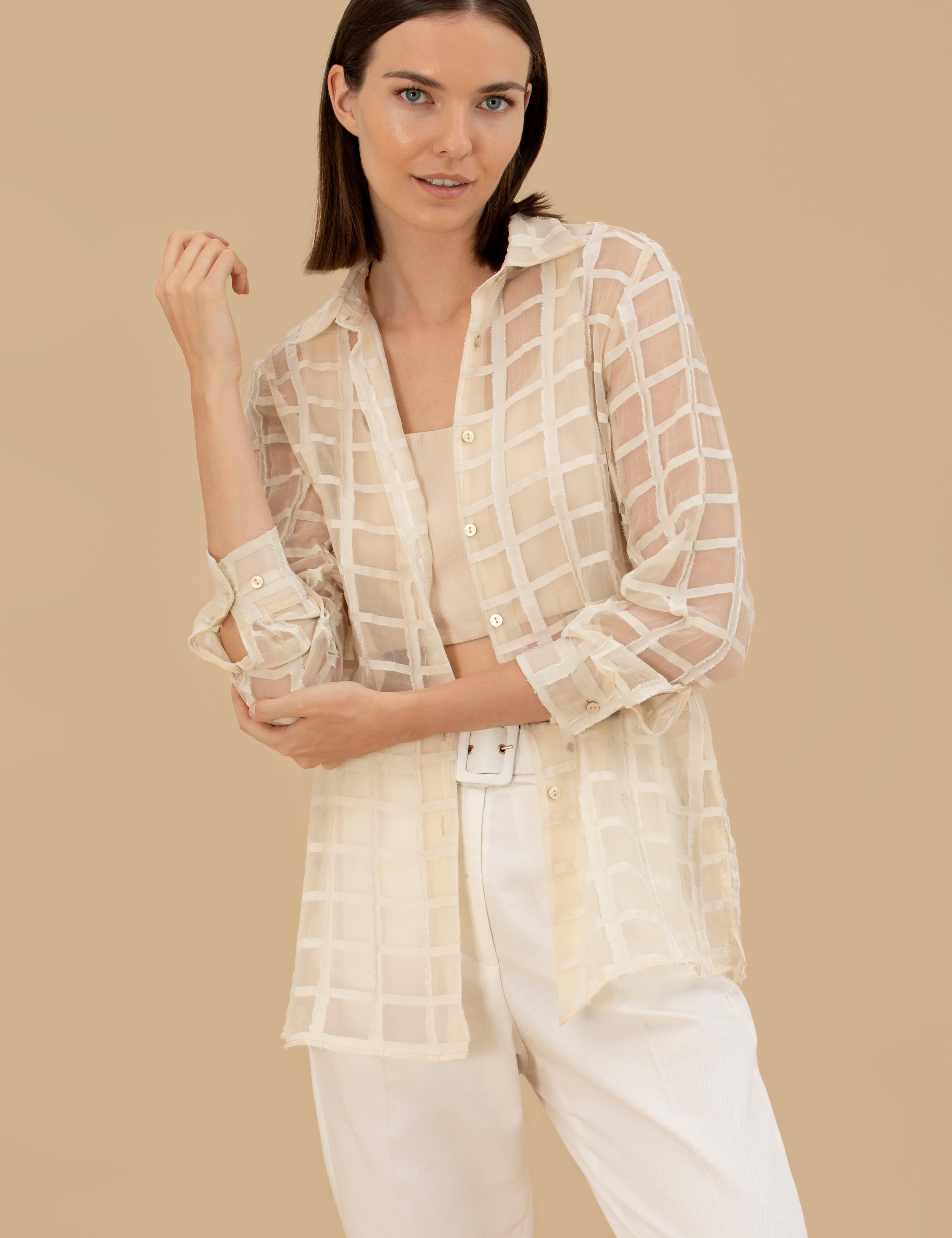 Krem Transparan Comfort Fit Uzun Kollu Gömlek