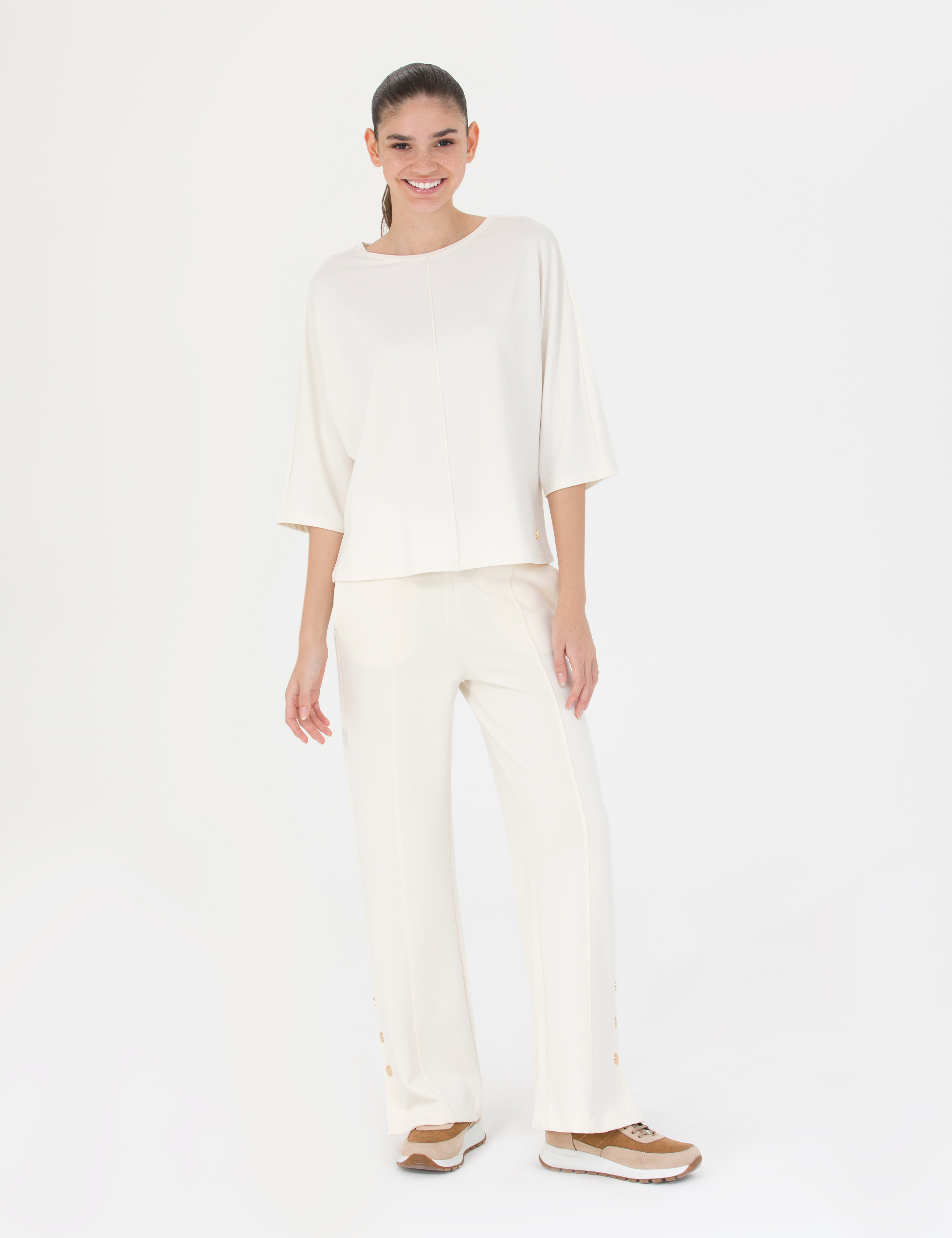 Krem rengi düz örgü pantolon, sade ve rahat tasarımıyla günlük şıklığı ön plana çıkarmaktadır. Regular fit kesimiyle vücuda rahatça oturan pantolon, esnek yapısı sayesinde gün boyu konforlu bir kullanım sunmaktadır. Pantolonun dokusu yumuşak olup, cildin nefes almasını sağlayan hafif bir kumaştan üretilmiştir. Günlük aktivitelerinizde ya da iş hayatınızda rahatlıkla kullanabileceğiniz pantolon, çok yönlü kombinler yapmanıza olanak tanır.