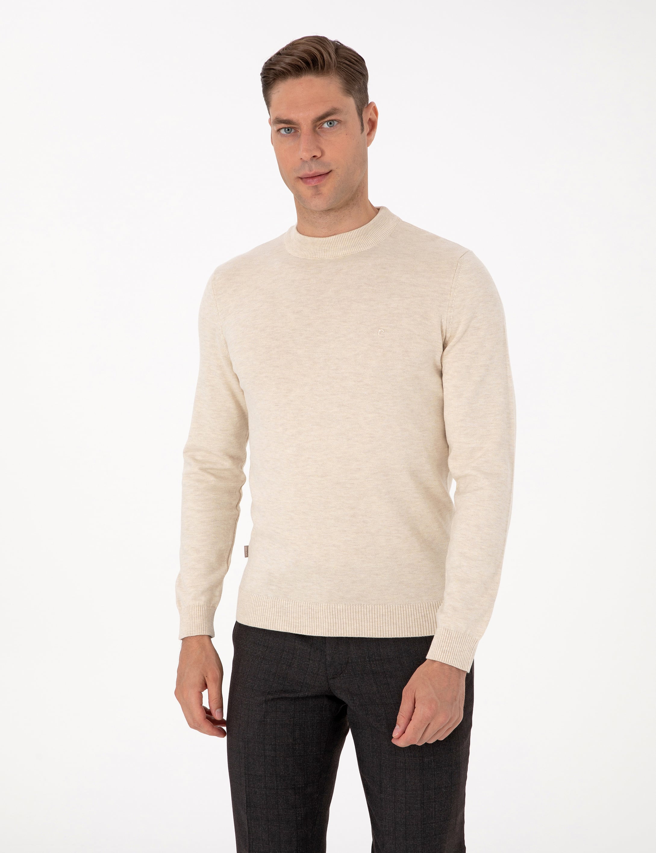 Krem Melanj Slim Fit Çeyrek Yaka Basic Triko Kazak
