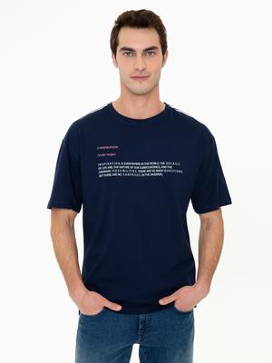 - Lacivert Comfort Fit Baskılı Bisiklet Yaka Tişört