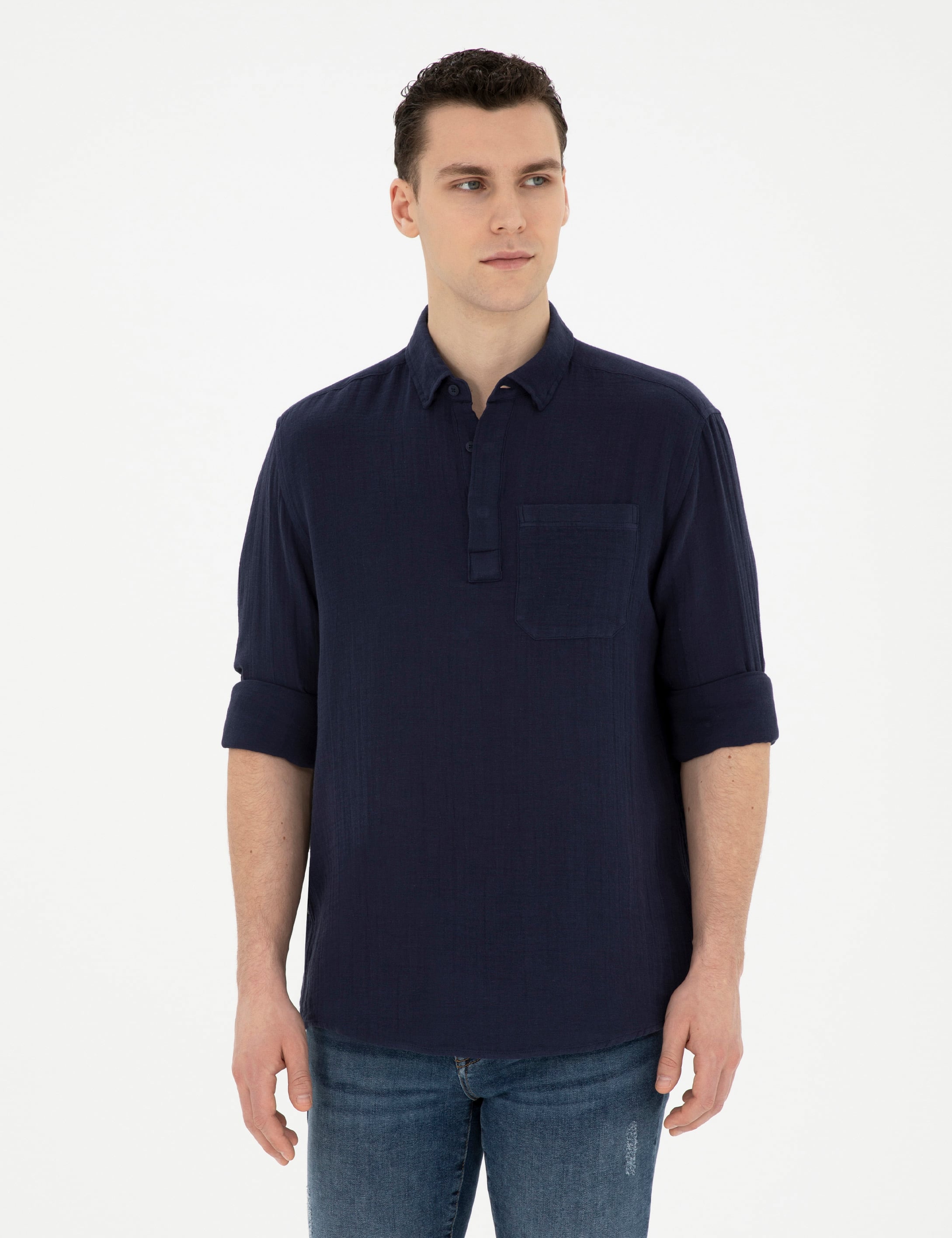 Cilde nefes aldıran birinci sınıf kalitedeki kumaşlarla üretilen uzun kollu lacivert comfort fit erkek gömlek modelimiz pek çok yaş grubuna hitap edecek yıldız parçalar arasındadır.