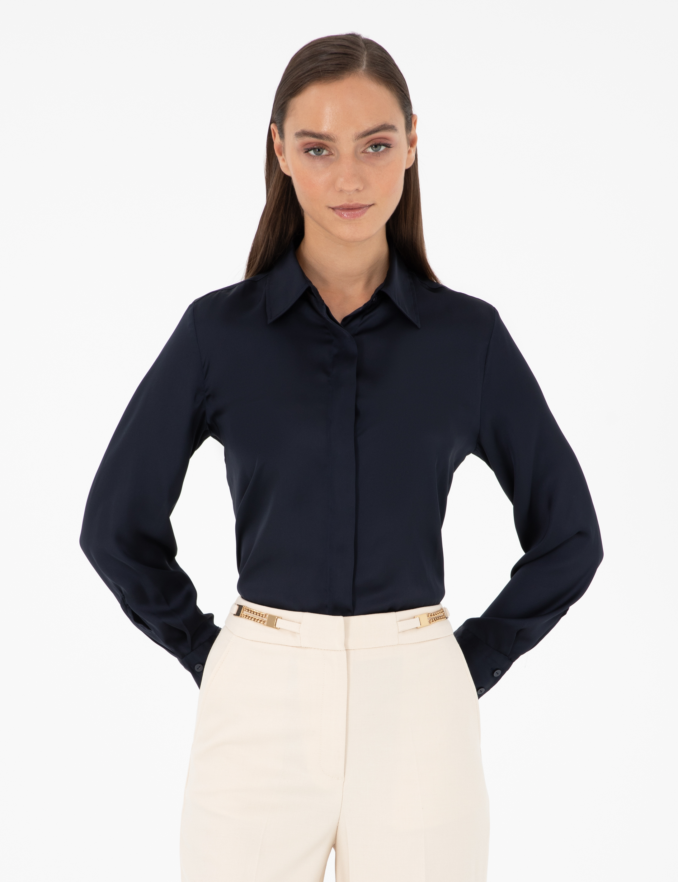 Uzun kolları ve düğmeli manşetleri, klasik bir görünüm sunarken katlanarak daha rahat ve günlük bir stile uyum sağlar. Lacivert tonu, her kombine kolayca uyum sağlayarak hem klasik hem modern görünümler oluşturmanıza olanak tanır. Beyaz veya krem pantolonlarla zarif bir ofis stili yakalayabilir, jean pantolonlarla günlük şıklığı tamamlayabilirsiniz.