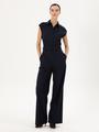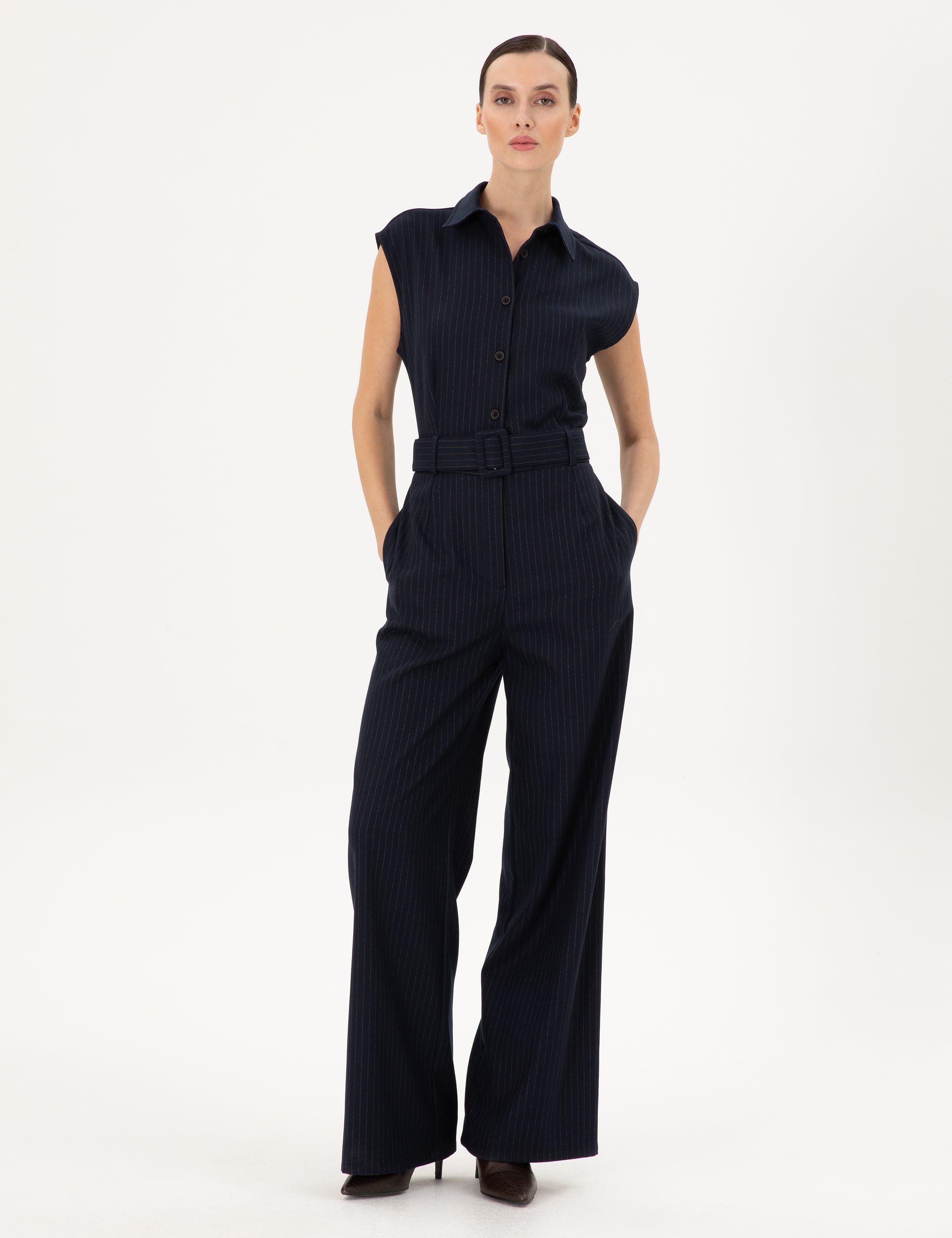Klasik ve maskülen çizgileri feminen detaylarla birleştiren lacivert tulum, hem gündüz hem de gece kullanımına uygun, etkileyici bir görünüm sağlar. Dik yaka ve kısa kap kollu tasarımı, keskin ve net bir duruş sergilerken, ön kısımda yer alan düğmeli kapama pratik bir kullanım sunar. İnce dikey çizgili deseni, tuluma hareket katarak zarif ve uzun bir siluet oluşturur. Bel kısmında yer alan kemer detayı, vücuda oturan formuyla ince bir bel görünümü sağlar ve tulumun yapısını tamamlar.