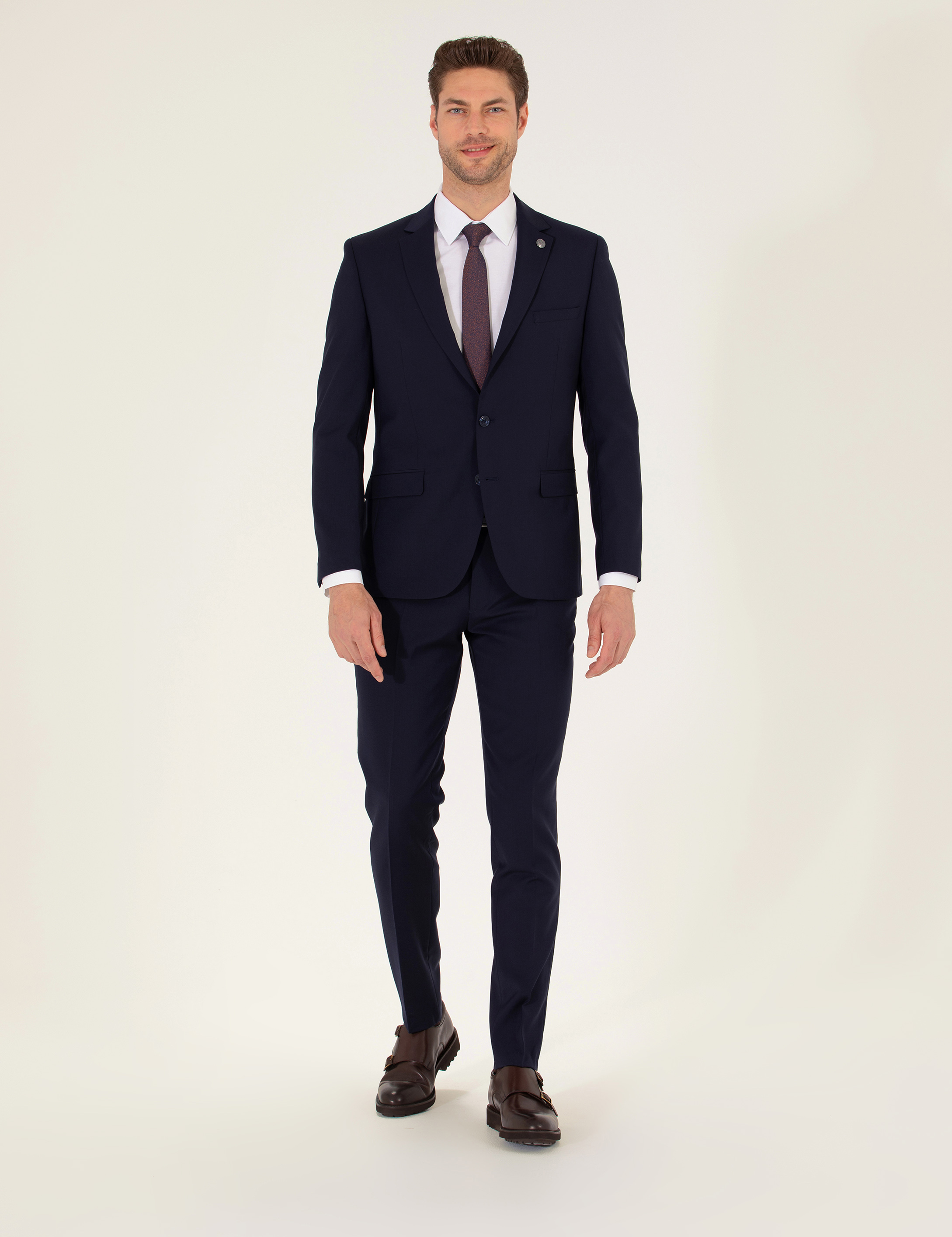 * %100 Yün Mono yaka, düz desenli ve ekstra slim fit erkek takım elbise modelimiz klasik kapaklı ceplere sahiptir.