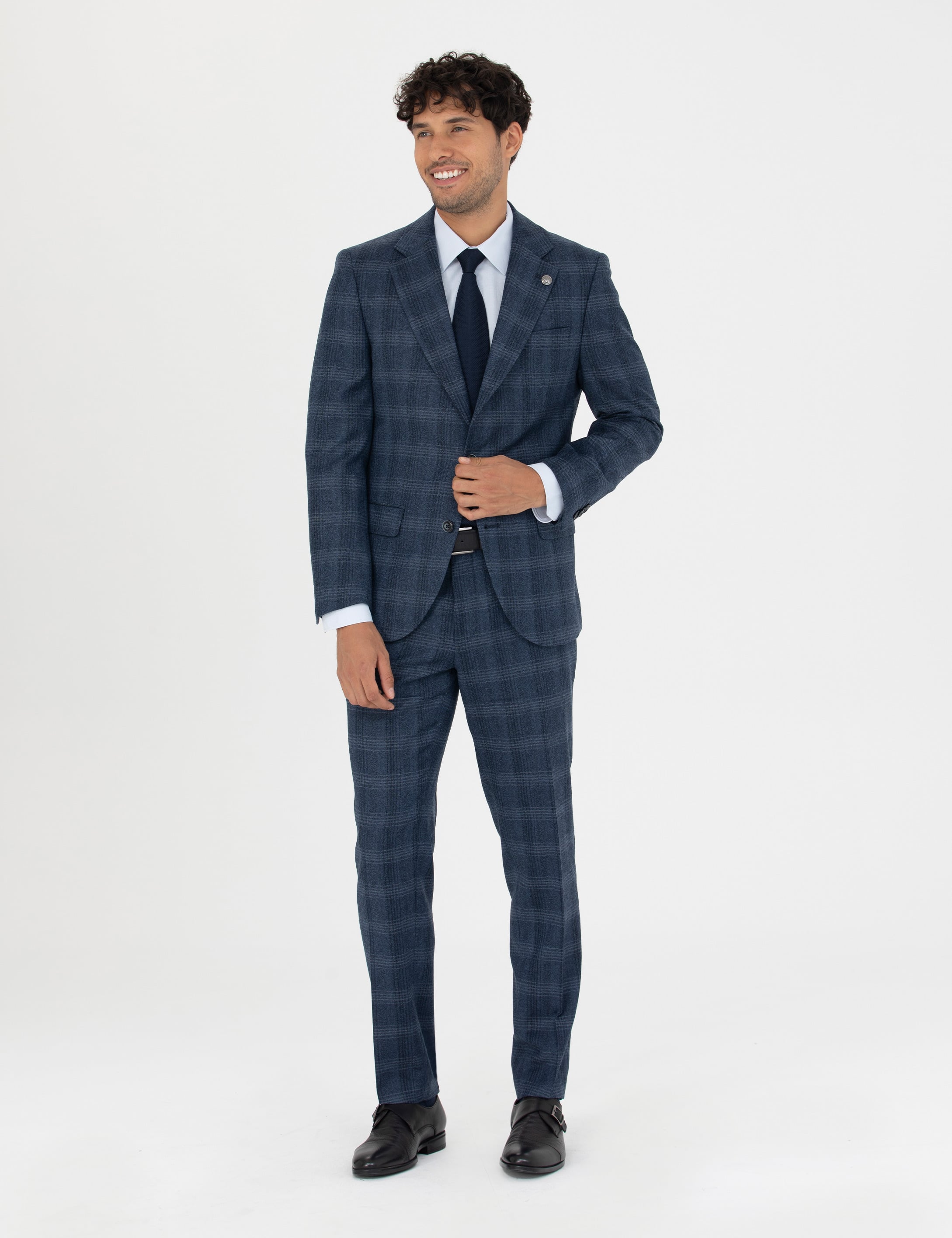 - %100 Yün Ekose Lacivert Ekstra Slim Fit Takım Elbise
