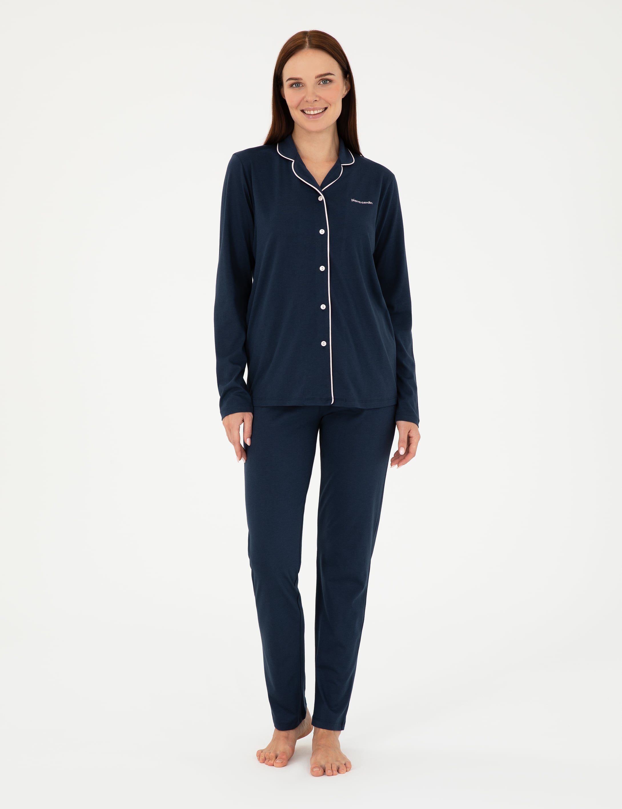 Apaş yaka detayı klasik pijama tarzını modern bir dokunuşla yeniden yorumluyor. Yakanın etrafındaki ince beyaz şeritler, lacivertin derinliğiyle hoş bir uyum oluşturarak farklı bir hava katıyor. Düğme kapamalı ön kısmı, kullanım kolaylığı sağlarken şıklığınızı da tamamlıyor.