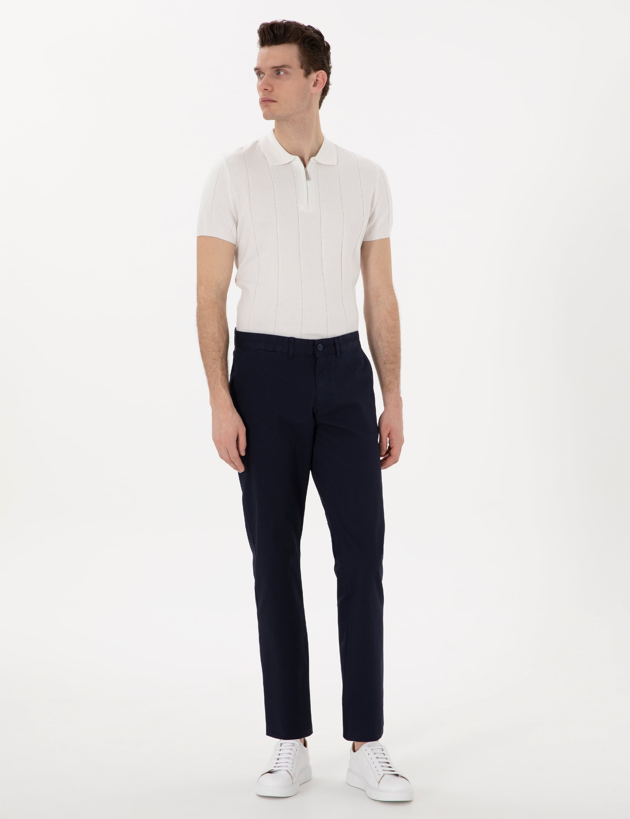 Pierre Cardin Lacivert Regular Fit Kanvas Pantolon, modern erkeğin gardırobuna zarafet ve konfor katmak için tasarlandı; sıkı dokuma kanvas yapısı sayesinde gün boyu rahat hareket etmenizi sağlarken, anatomik bel girintisi ve destekli kemer arkası gün içinde duruşunuzu korur, derin cep detayları ise telefonunuzdan cüzdanınıza kadar eşyalarınızı güvenle taşır; yıpranmaya dirençli dokusu ile uzun ömürlü kullanım sunan bu pantolonu ofisten akşam buluşmalarına kadar her ortamda tercih edebilirsiniz. Beyaz basic tişört ve beyaz sneaker’larla şıklığınızı tamamlayın.