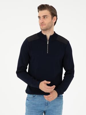 Lacivert Regular Fit Fermuarlı Dik Yaka Triko Kazak