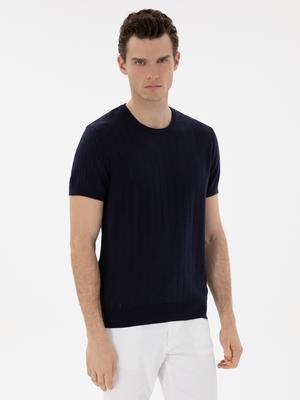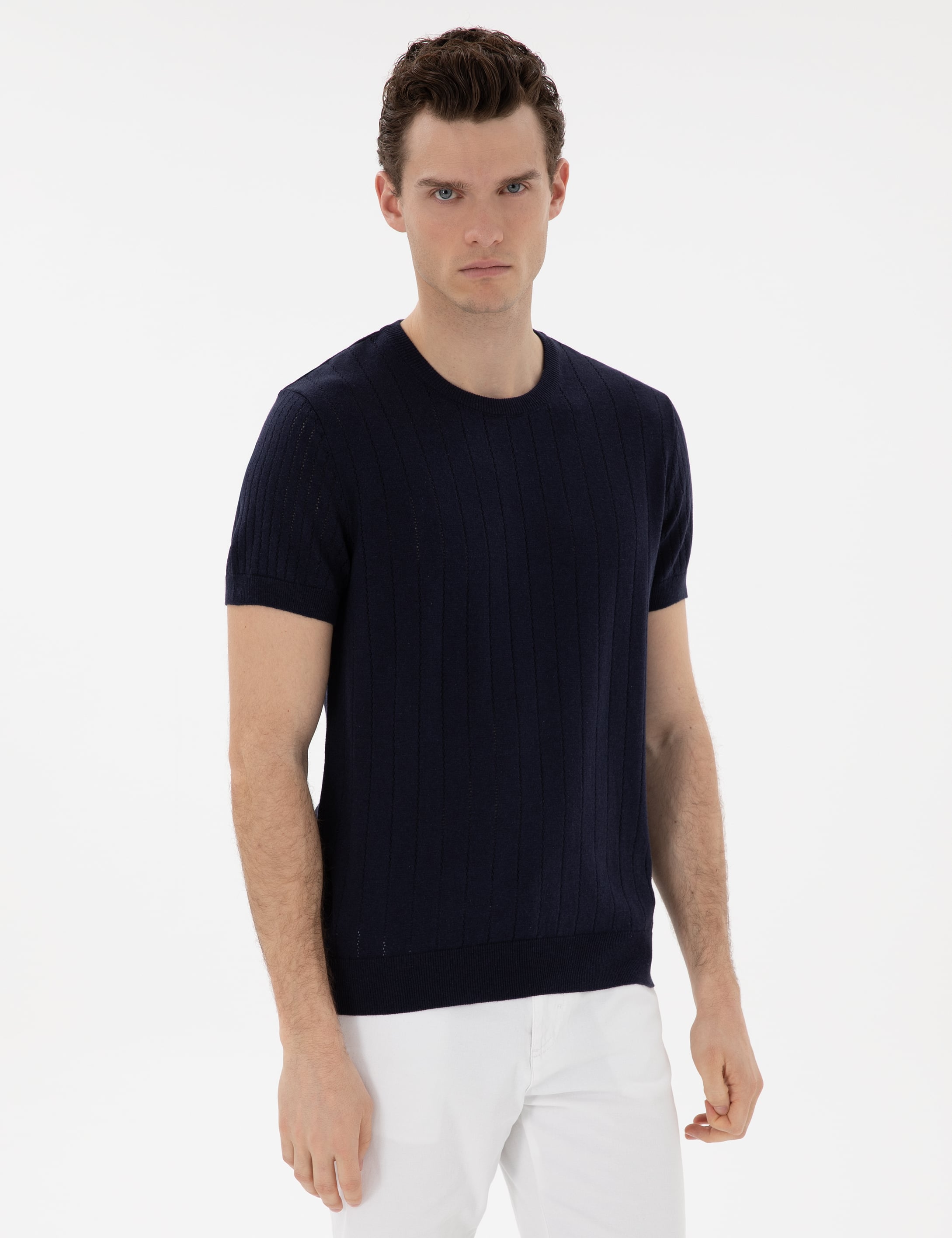 - Lacivert Keten Karışımlı Regular Fit Bisiklet Yaka Triko Tişört