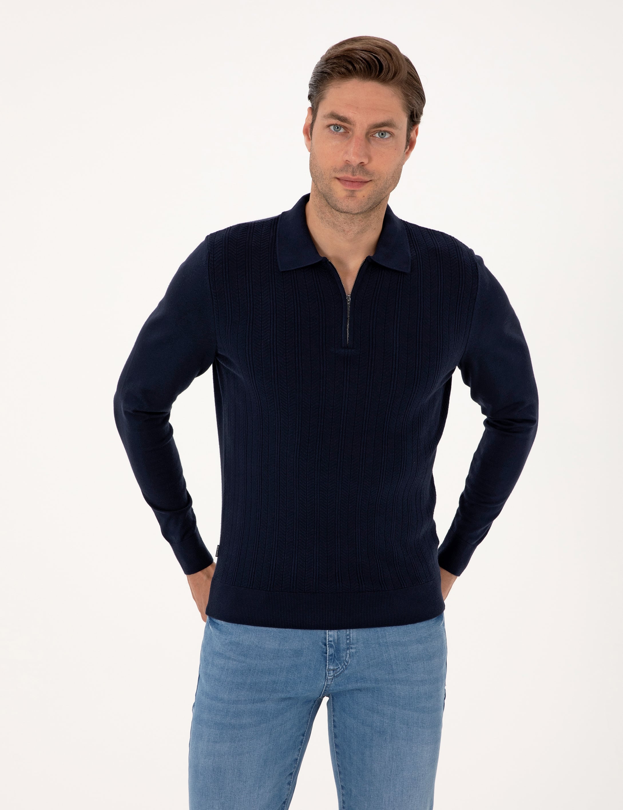 Lacivert Regular Fit Polo Yaka Fermuarlı Triko Kazak