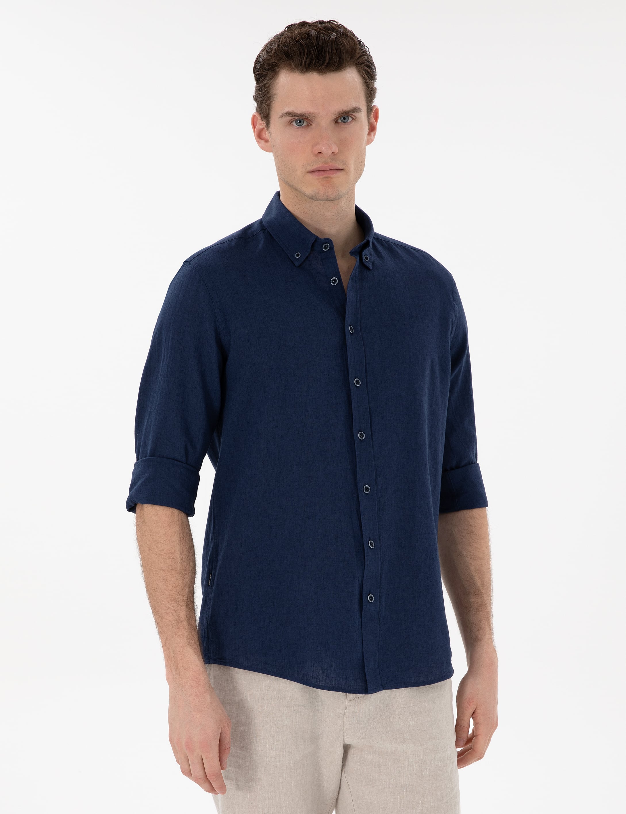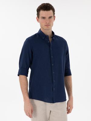 Lacivert Keten Karışımlı Regular Fit Uzun Kollu Gömlek