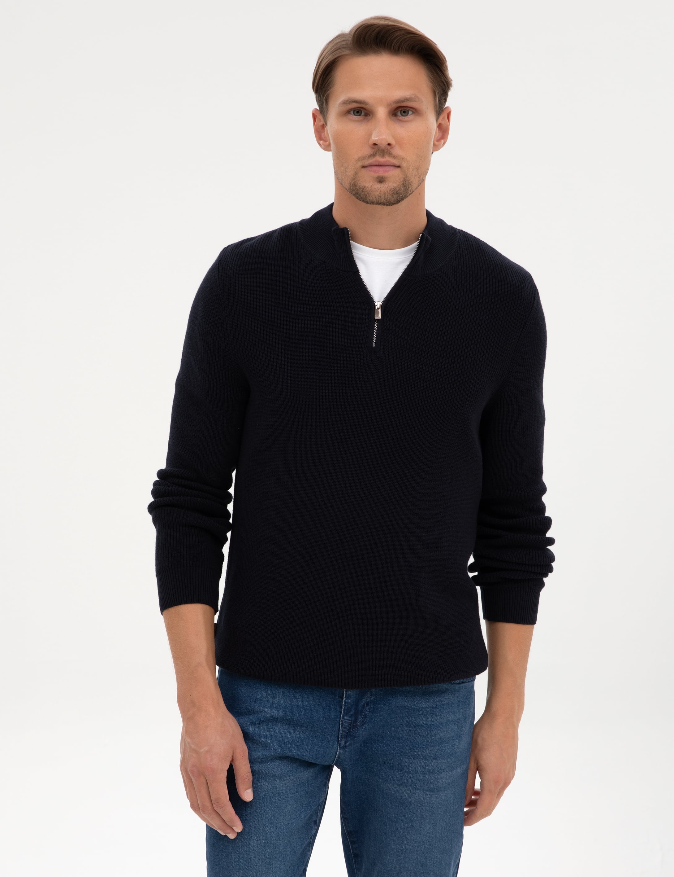 Lacivert Slim Fit Dik Yaka Fermuarlı Triko Kazak