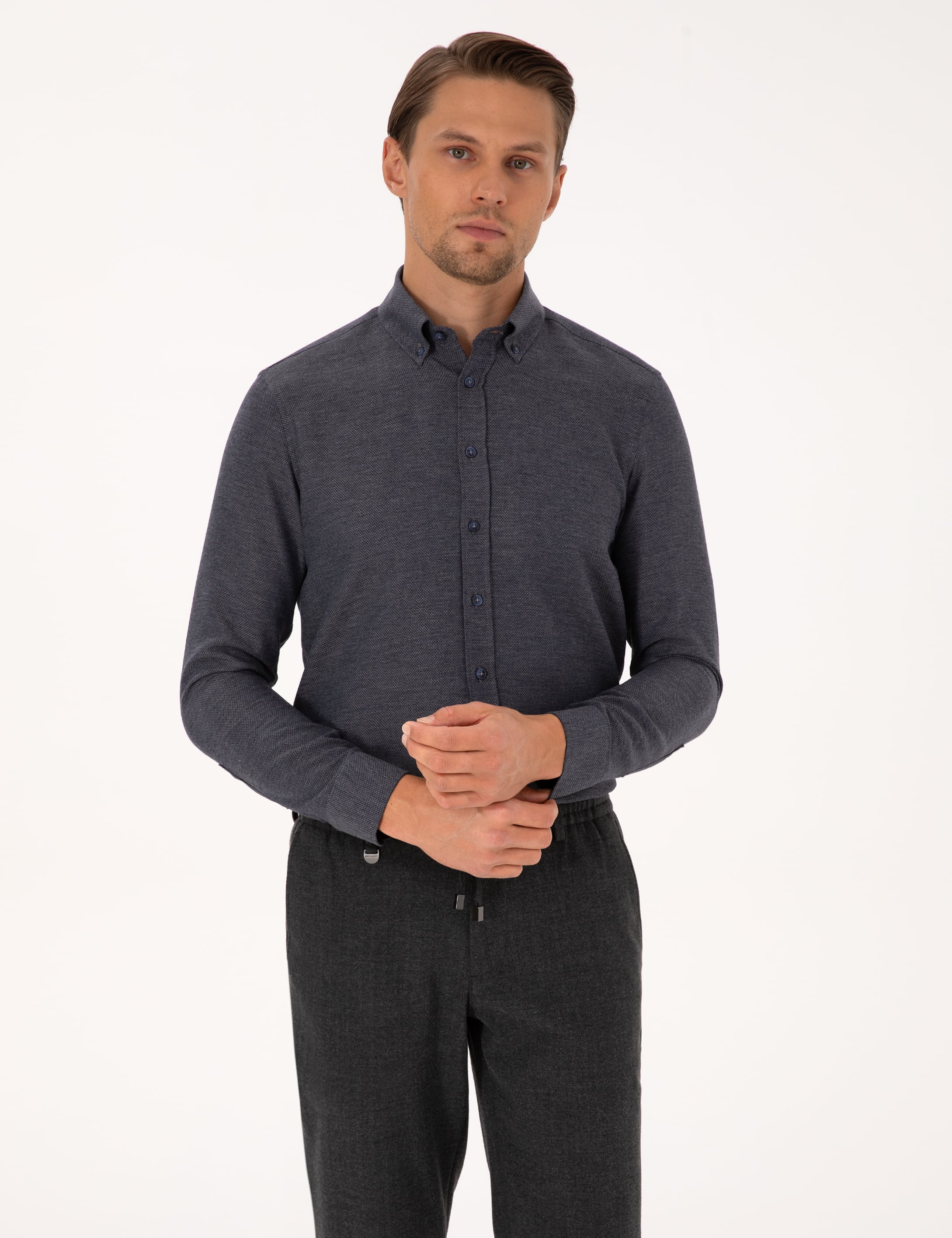 - Lacivert Slim Fit Dokulu Uzun Kollu Gömlek