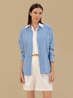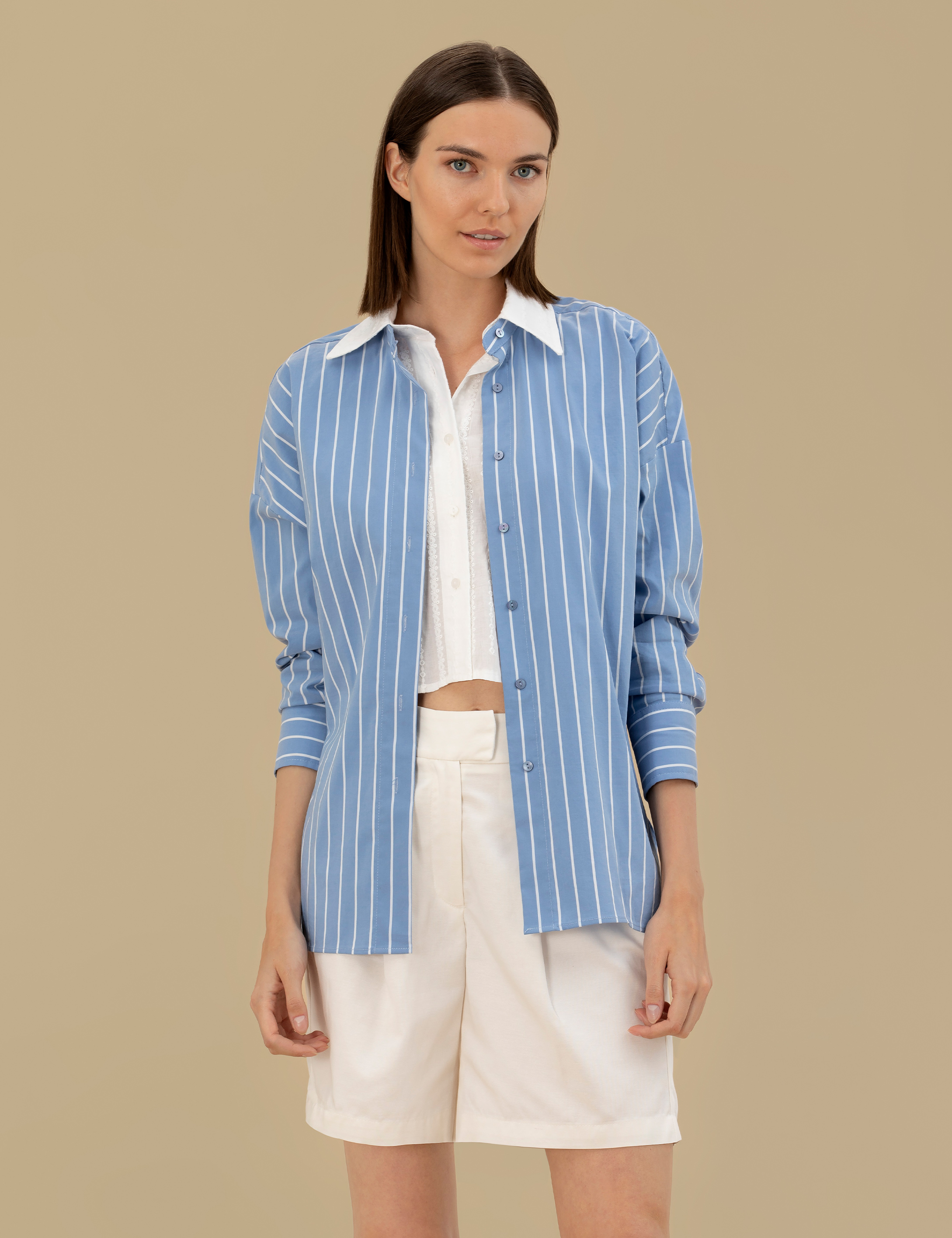 Mavi Oversize Uzun Kollu Çizgili Gömlek