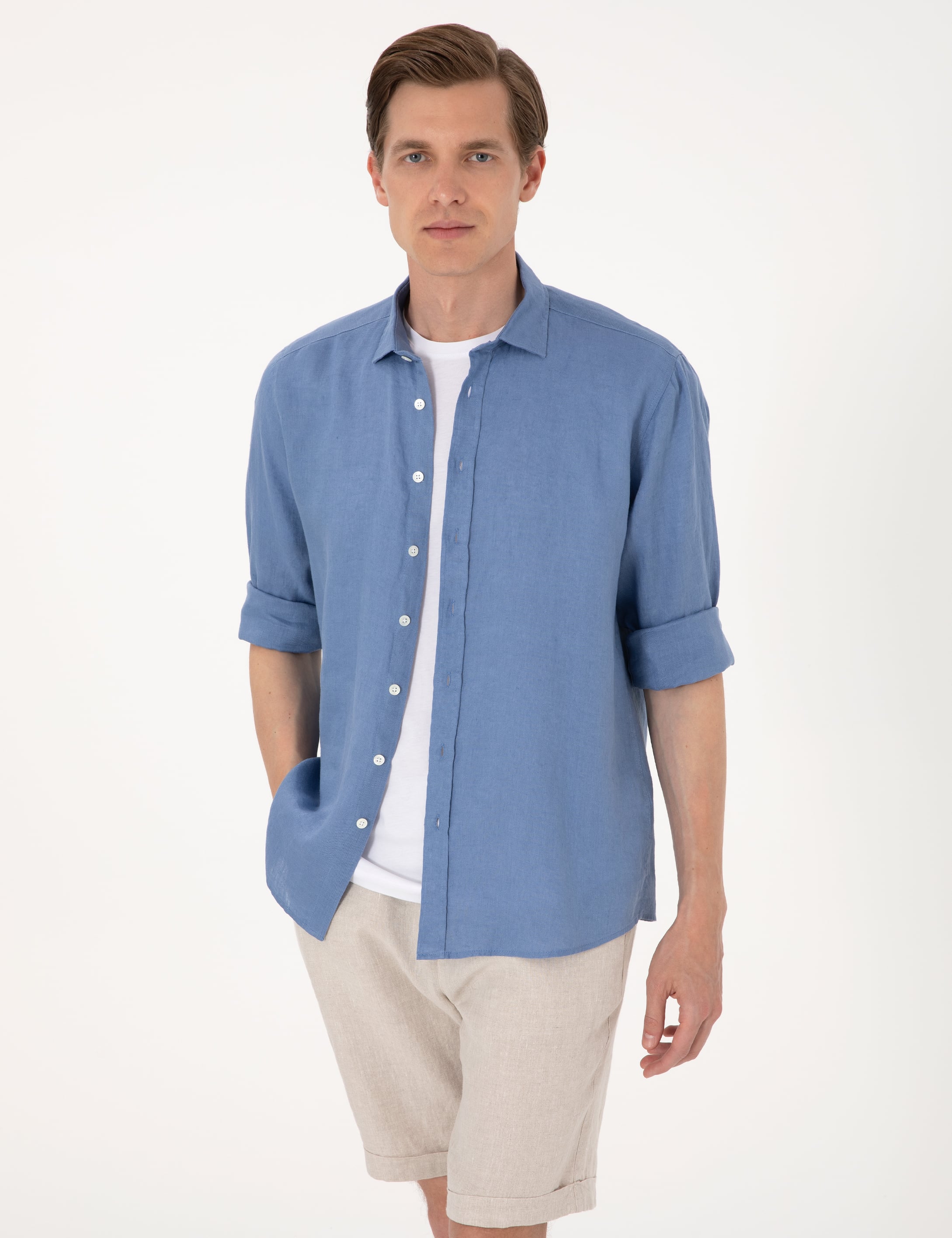Mavi %100 Keten Regular Fit Uzunkollu Gömlek