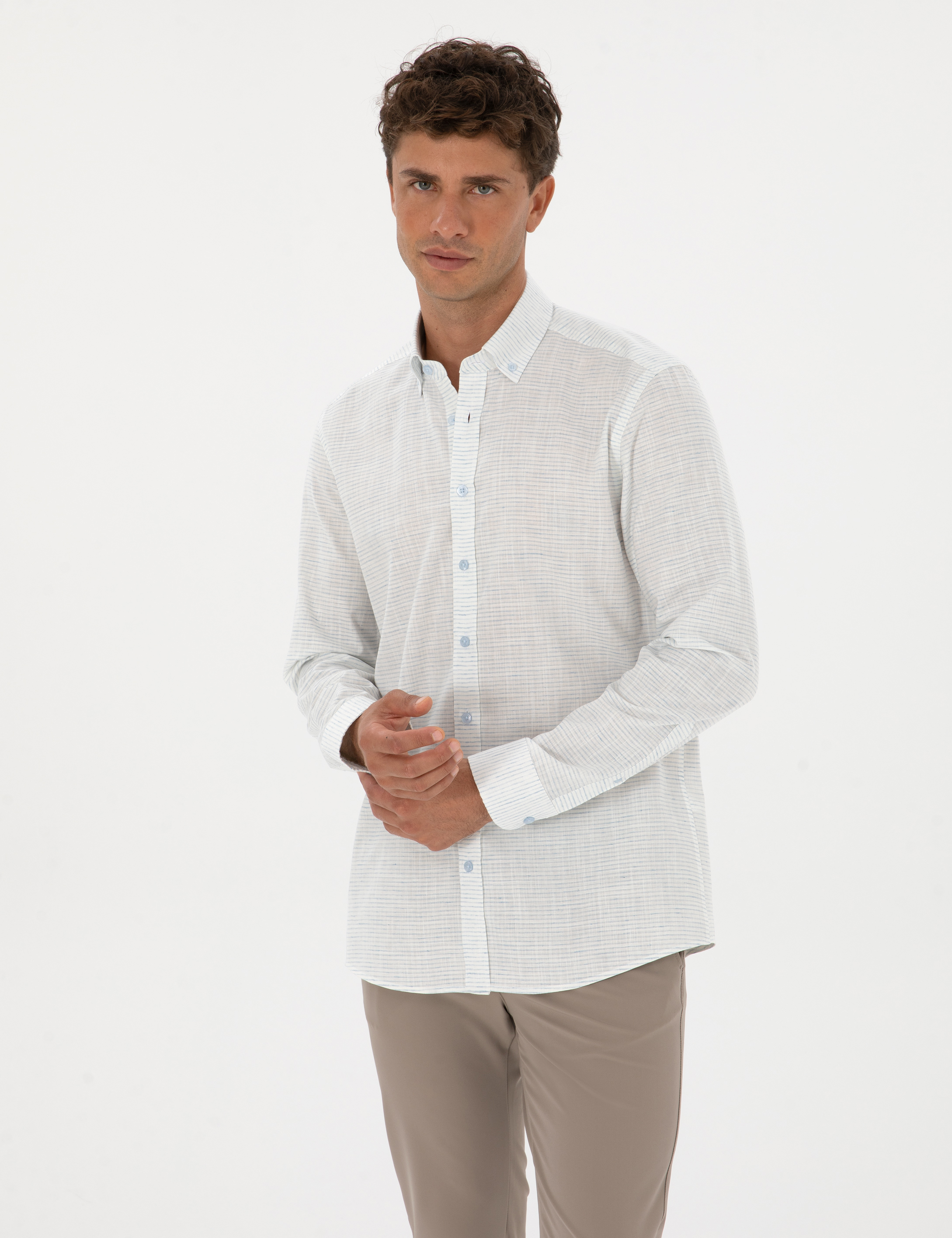 Mavi Keten Karışımlı Regular Fit Uzun Kollu Gömlek