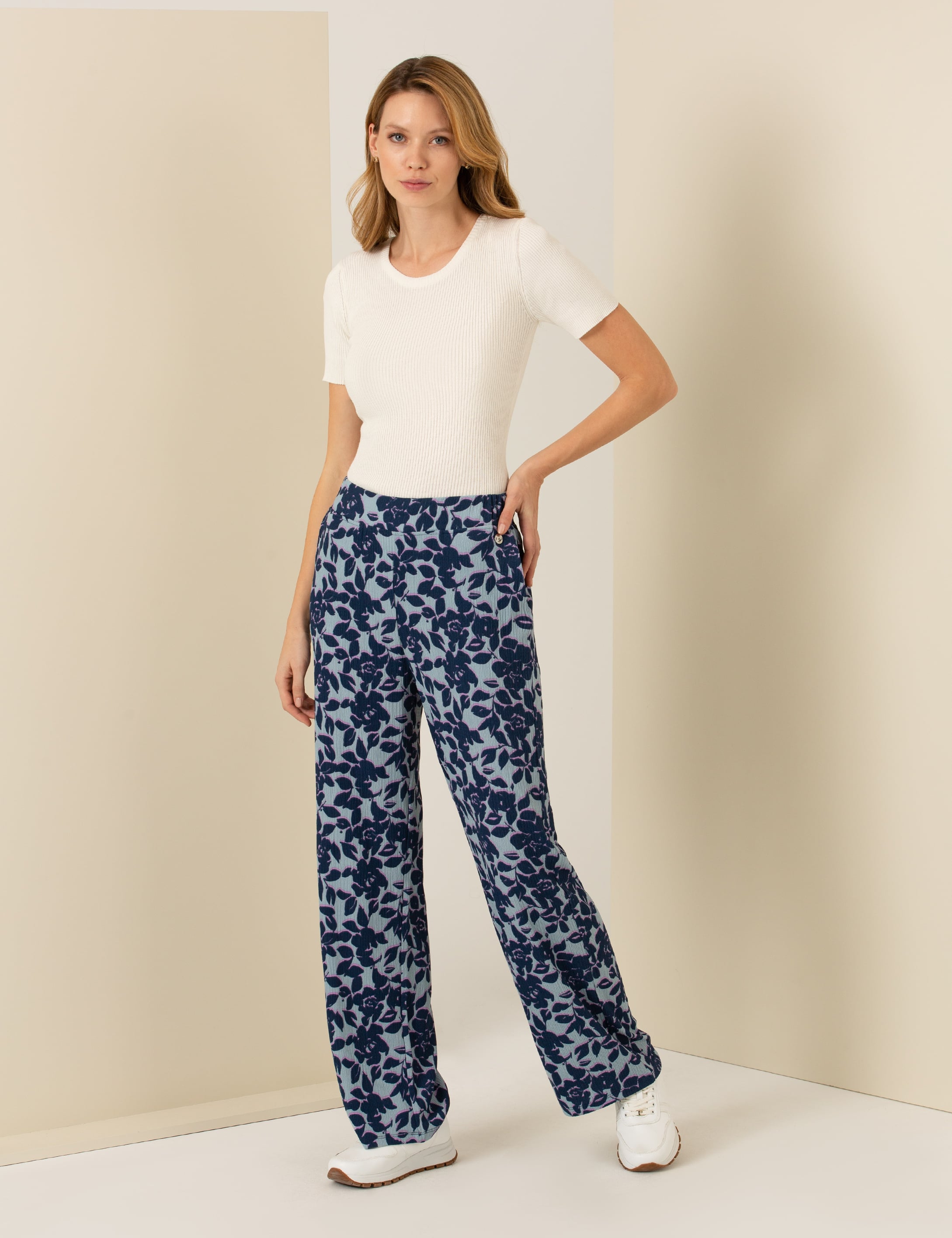 Koyu mint rengindeki loose fit örgü pantolon, desenli yapısı ve rahat kesimiyle günlük kullanıma uygun şık bir seçenek sunmaktadır. Loose fit kesimi bacaklara ekstra rahatlık sunarken, geniş yapısı sayesinde gün boyu hareket özgürlüğü sağlar. Elastik bel yapısı pantolonun vücuda tam oturmasını sağlayarak rahat bir kullanım imkânı verir. Desenli yapısı pantolona modern ve canlı bir hava katar, bu da onu klasik pantolonlardan farklı kılar.