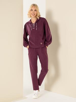 Mürdüm rengi örgü pantolon, sade ve rahat bir tasarımla dikkat çekmektedir. Düz kesimi ve yumuşak dokusuyla hem günlük kullanımda hem de evde rahatlık sunmaktadır. Kumaşının nefes alabilir yapısı, uzun süreli kullanımlarda bile konfor sağlamaktadır. Hafif ve esnek oluşu, özellikle hareket halindeyken vücudu rahatça sarmasına yardımcı olmaktadır. Pantolonun bel kısmındaki elastik yapı, farklı vücut tiplerine kolayca uyum sağlayarak kullanım kolaylığı sunmaktadır.