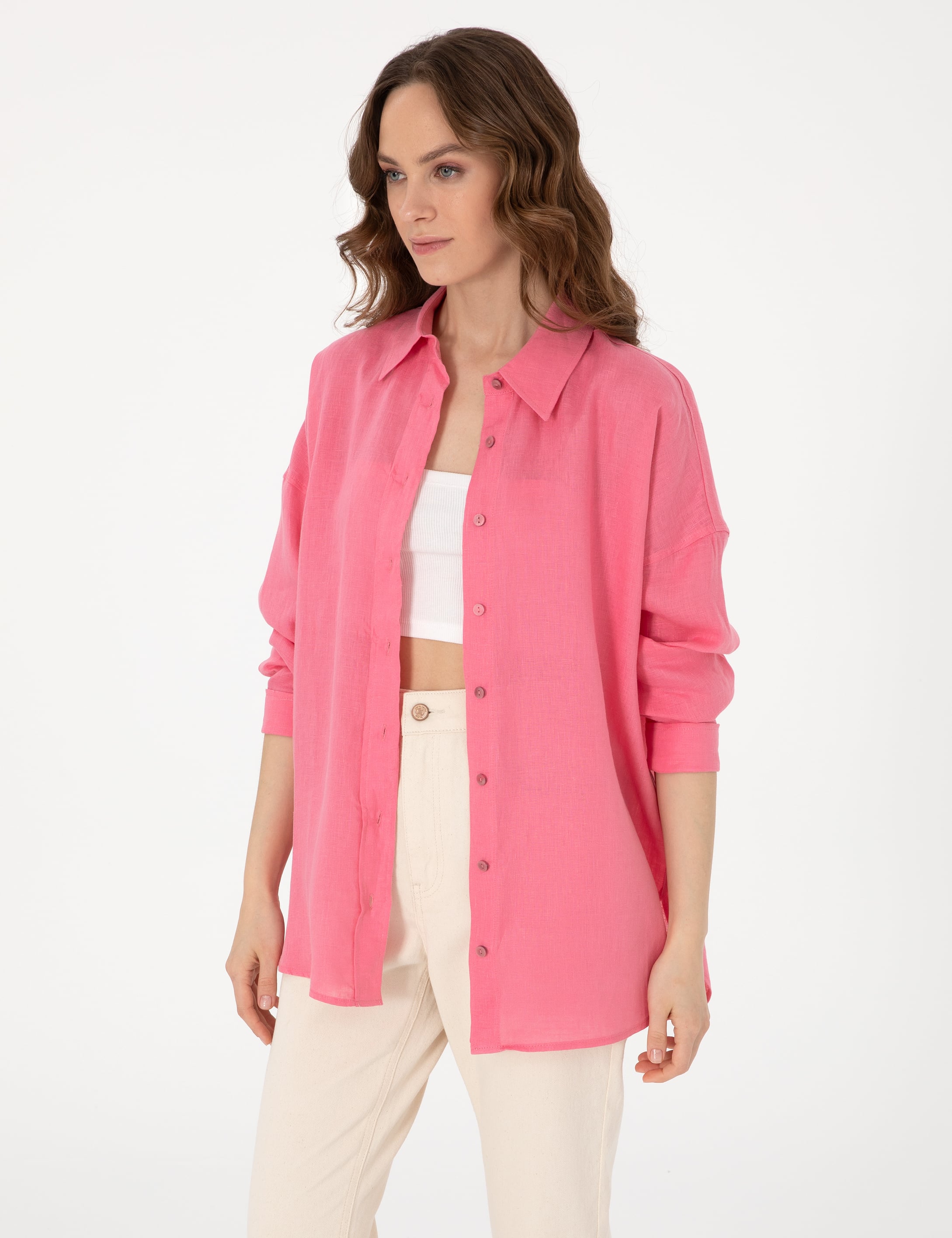 Pembe Oversize Uzun Kollu %100 Keten Gömlek