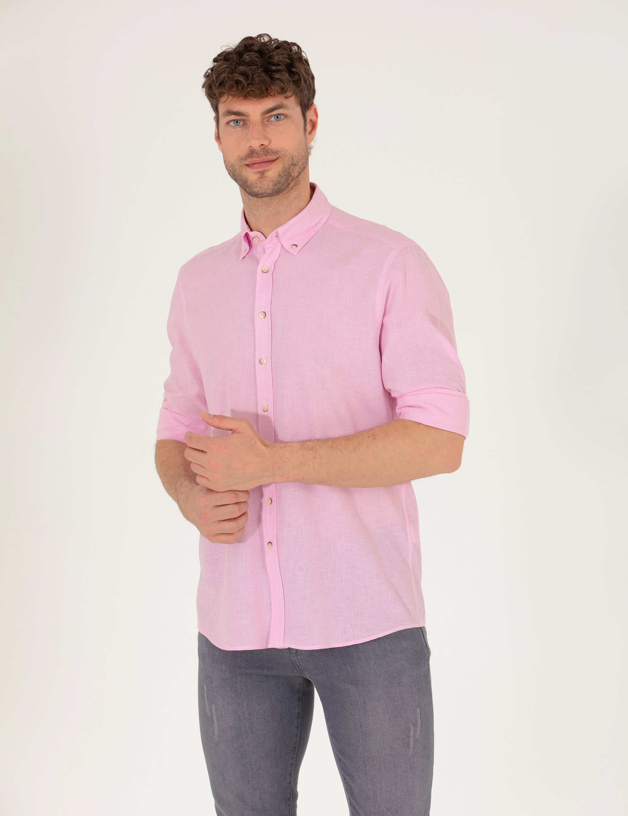 Pembe Keten Karışımlı Regular Fit Uzun Kollu Gömlek