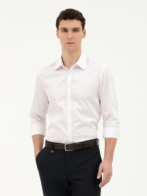 Dikine ince çizgili desenleri sayesinde hem dinamik hem de formda görünmenize yardımcı olan açık pembe slim fit erkek gömlek modelimiz vücudu hafifçe sarar.