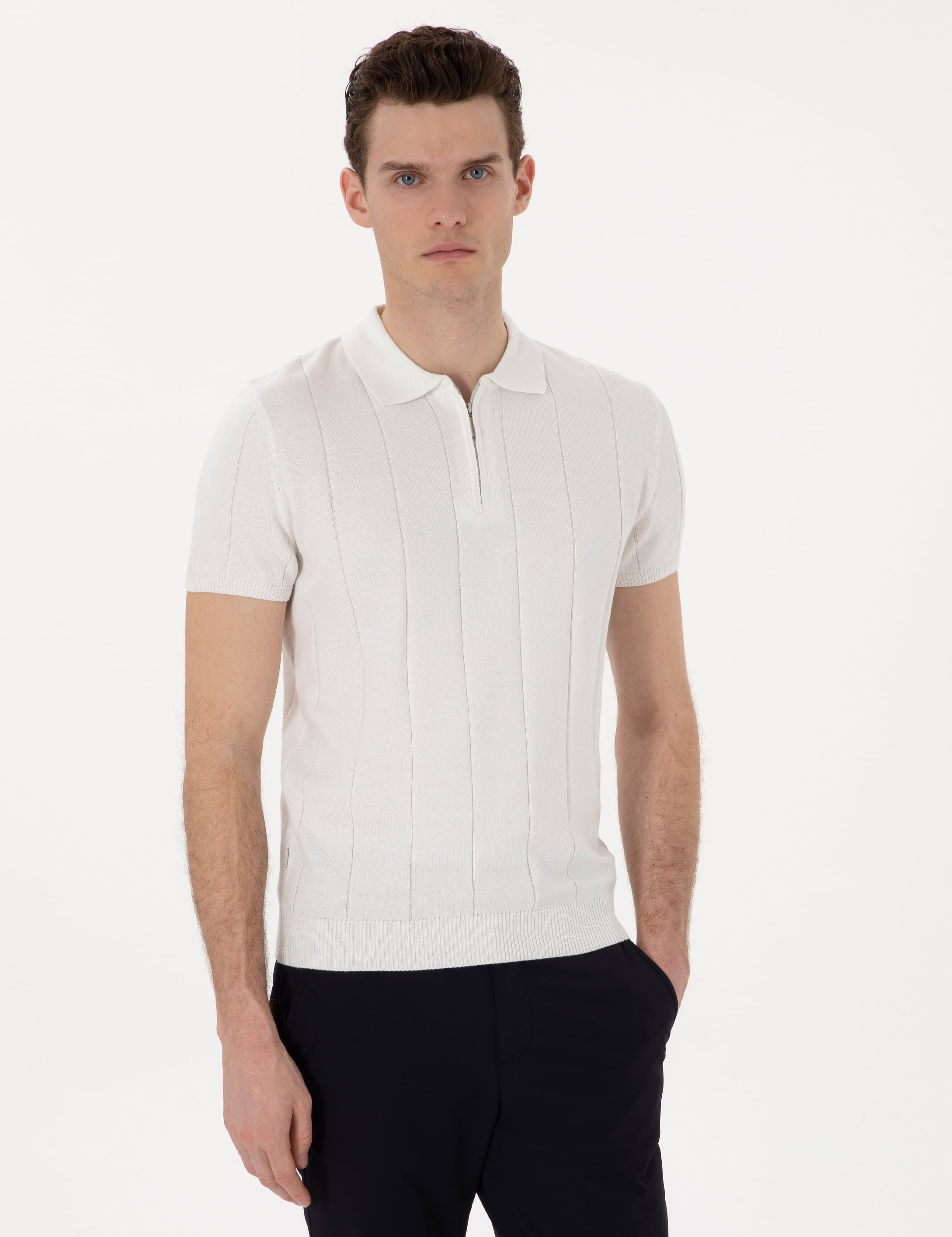 Ekru Slim Fit Fermuarlı Polo Yaka Triko Tişört