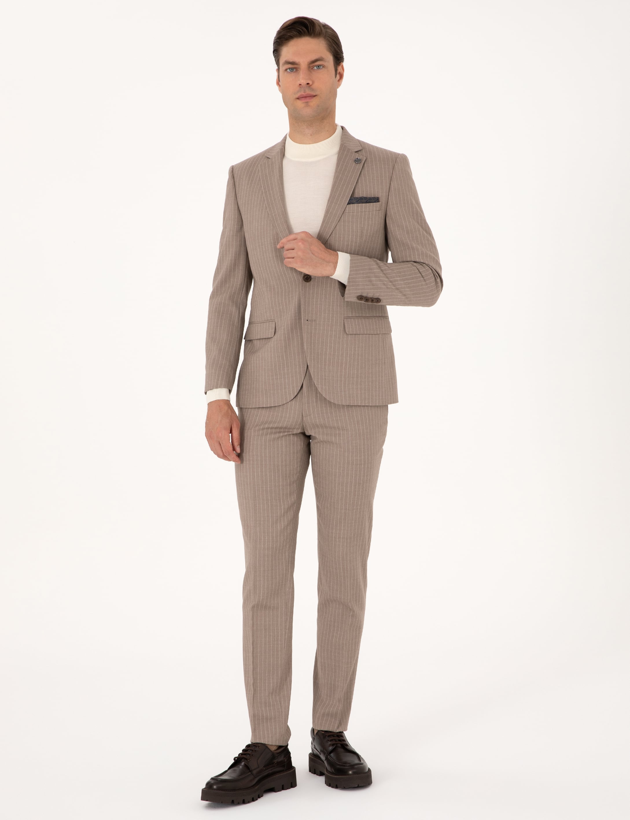 - Bej Ex. Slim Fit Yün Karışımlı Çizgili Takım Elbise