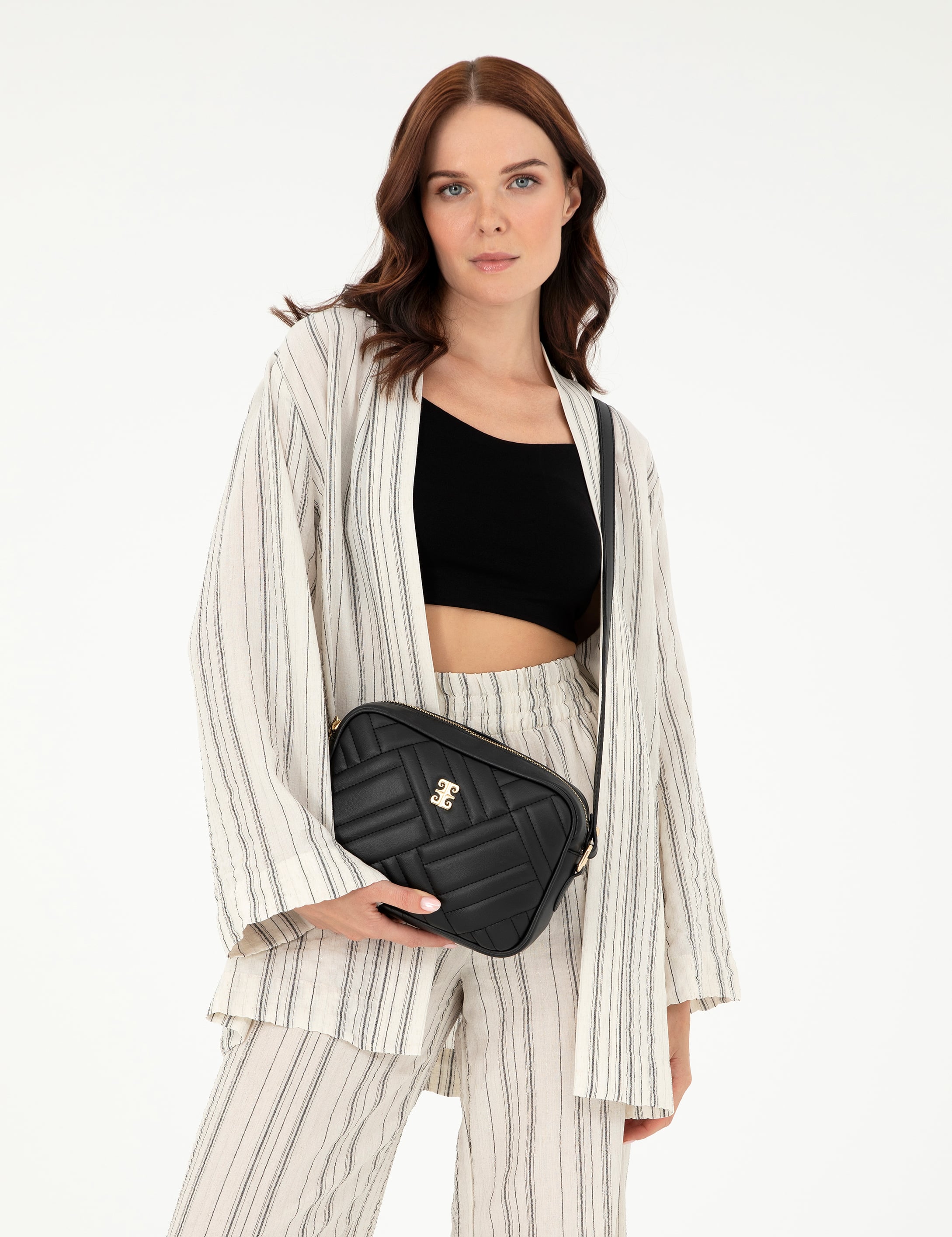 Ayarlanabilir omuz askı mevcuttur. Genişlik x Yükseklik x Derinlik: 23x17x6 cm'dir. Fermuarlı kapama özelliğine sahiptir. İçerisinde 1 adet fermuarlı iç cep bulunmaktadır. Telefon vb. eşyaları koymak için 1 adet fermuarsız iç cep bulunmaktadır. Suni deri malzemeden üretilmiştir.