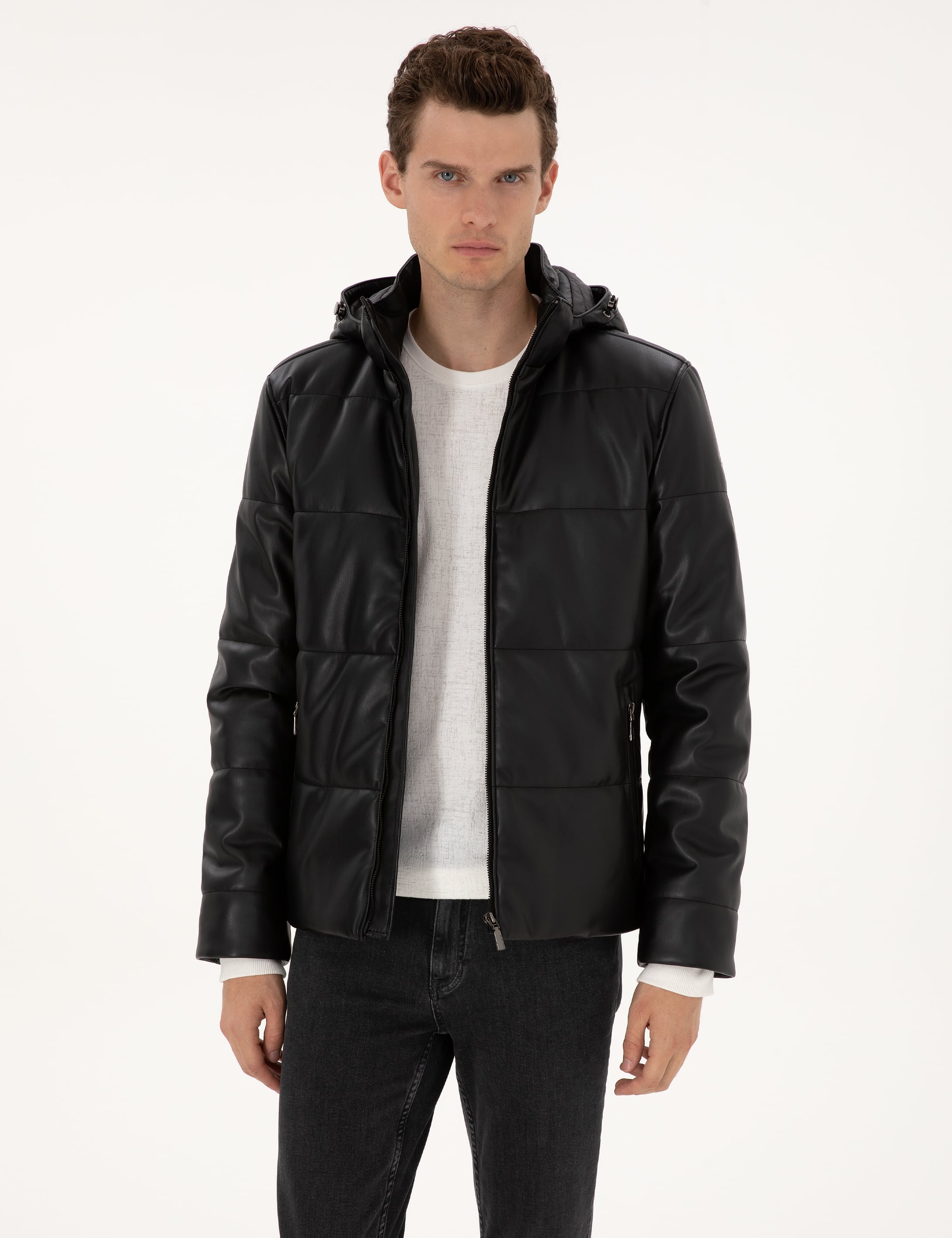 - Siyah Kapüşonlu Suni Deri Ceket