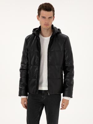 Siyah Kapüşonlu Suni Deri Ceket