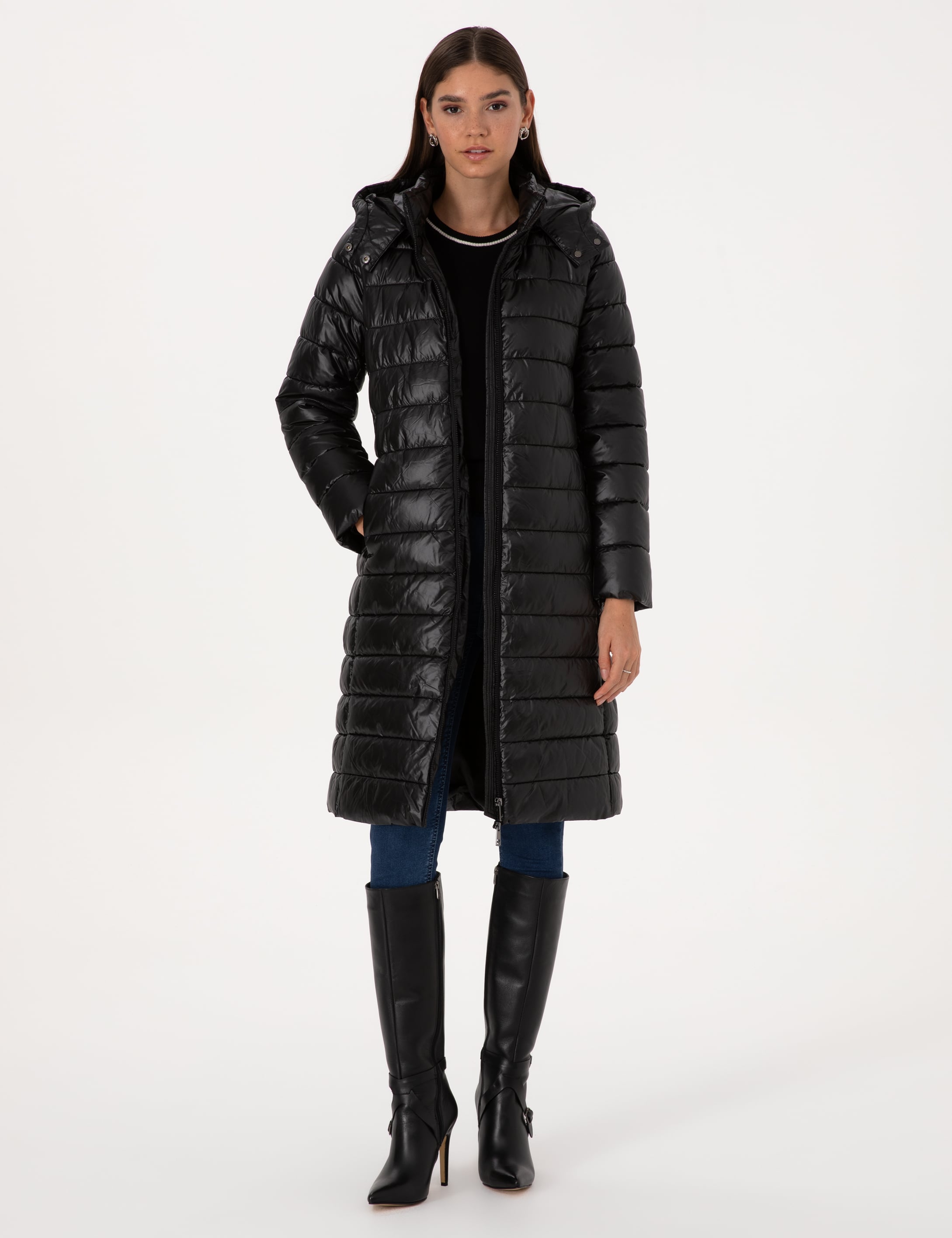 Siyah Çıkarılabilir Kapüşonlu Kapitone Uzun Mont