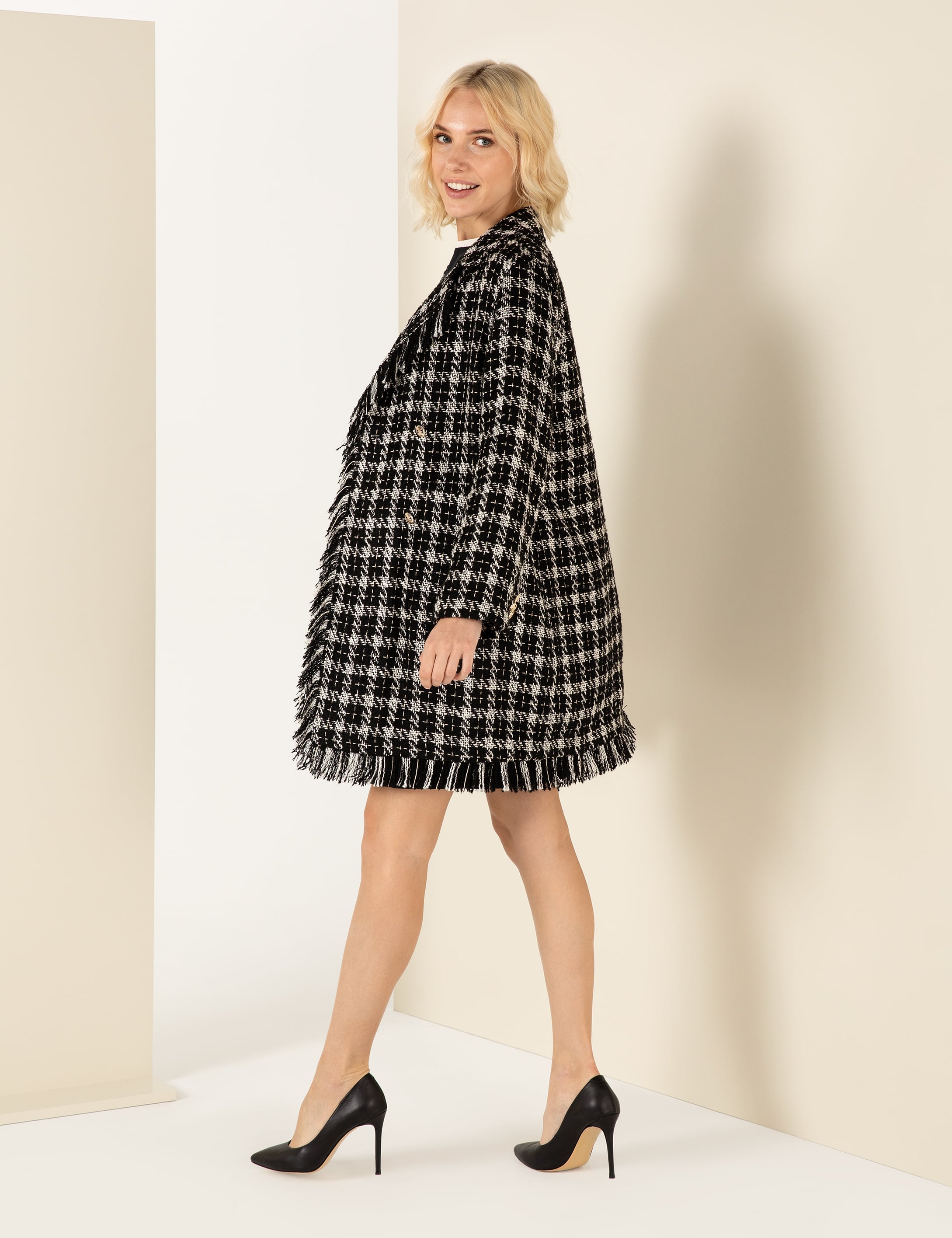 Kabanın püskül detayları tasarıma hareket katarken modern ve dikkat çekici bir görünüm oluşturuyor. Geniş kesimi ve rahat kalıbı soğuk havalarda kalın giysilerle kombinlenmesini kolaylaştırır. Desenli yüzeyi sade kıyafetlerle şık kontrast oluşturur böylece her türlü kombininizde öne çıkmanızı sağlar. Kabanın klasik siyah-beyaz renk tonları hem iş hayatında hem de özel davetlerde rahatlıkla kullanılabilir.