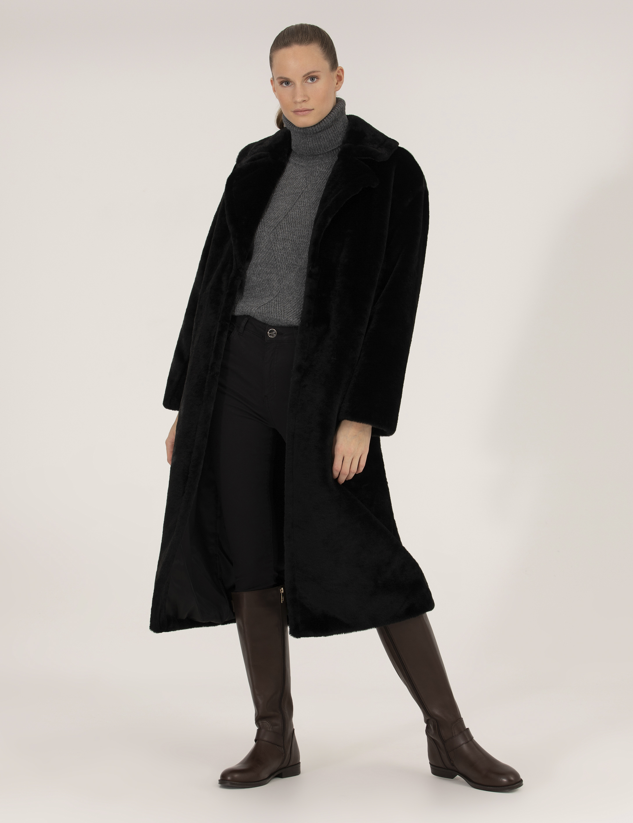 Dayanıklı malzemeden üretilmiş siyah peluş kaban, soğuk havalarda hem şıklığı hem de sıcaklığı bir arada sunuyor. Yumuşak dokusu ile dikkat çeken kaban, oversize kesimi sayesinde rahat bir kullanım sağlar. Vücuda tam oturmayan bol kesimi rahat hareket etme imkanı sunarken modern ve çarpıcı bir silüet oluşturur.