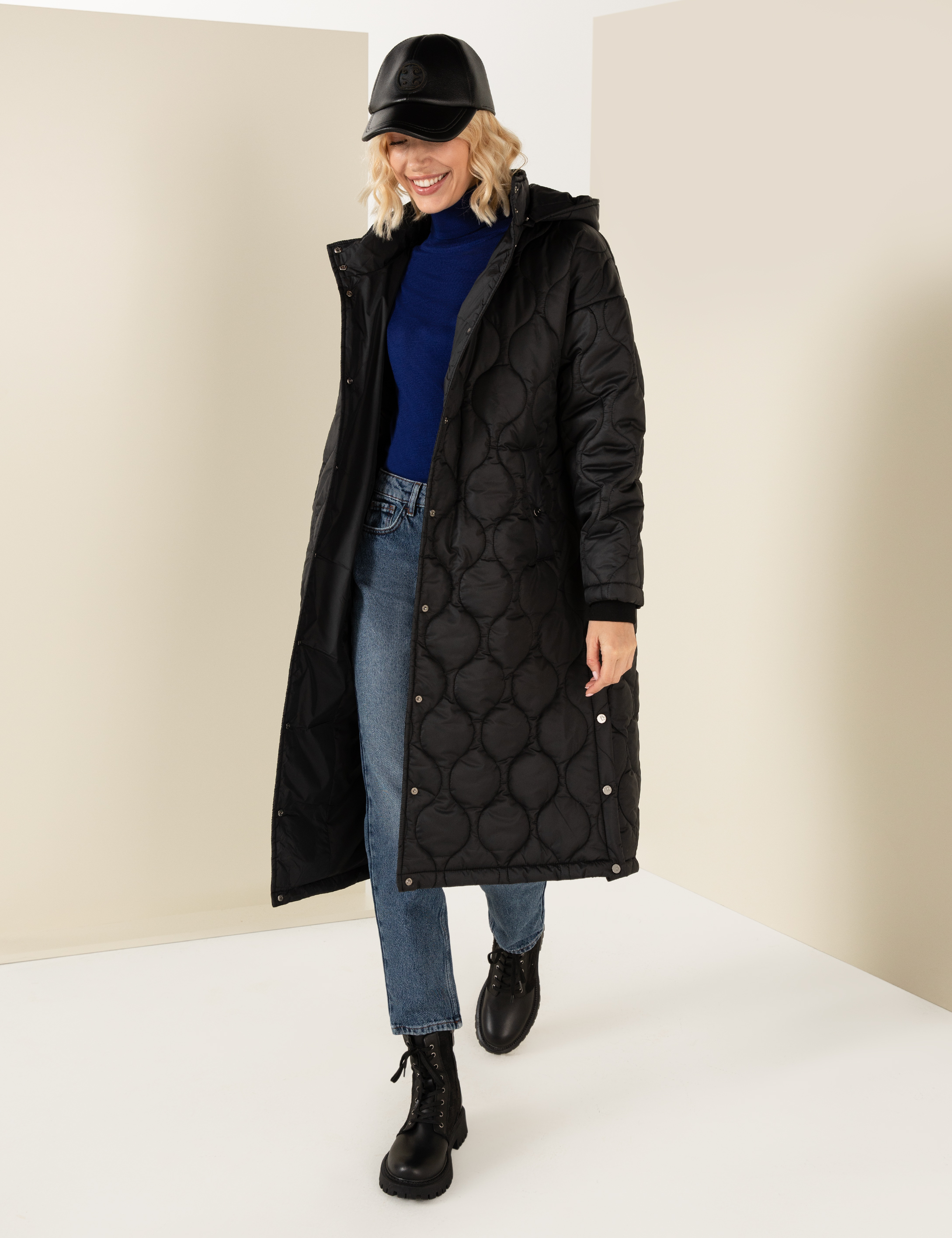 Montun uzun kesimi, soğuk günlerde vücudunuzu tam anlamıyla sararak sıcak kalmanızı sağlar. Kapüşon detayı ise rüzgarlı ve yağışlı günlerde ekstra koruma sunar böylece dış mekanlarda rahatlıkla kullanılabilir. Fermuar ve çıtçıt kapama sistemi montu pratik şekilde giyip çıkarma kolaylığı sağlar ve iç mekan sıcaklığını korur. Montun kapitone dikişleri, tasarıma modern dokunuş katarken sıcaklığı muhafaza etmeye yardımcı olur.