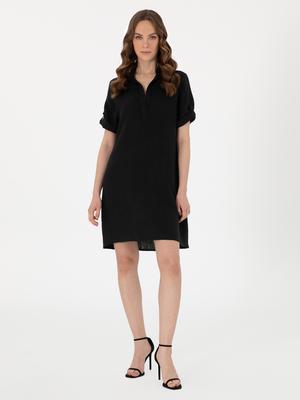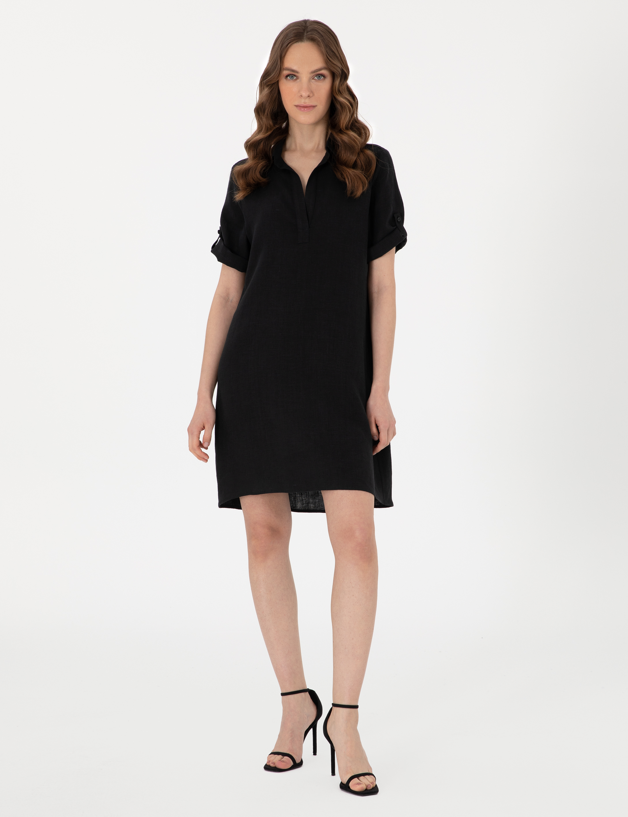 Siyah Regular Fit Keten Kısa Dokuma Elbise