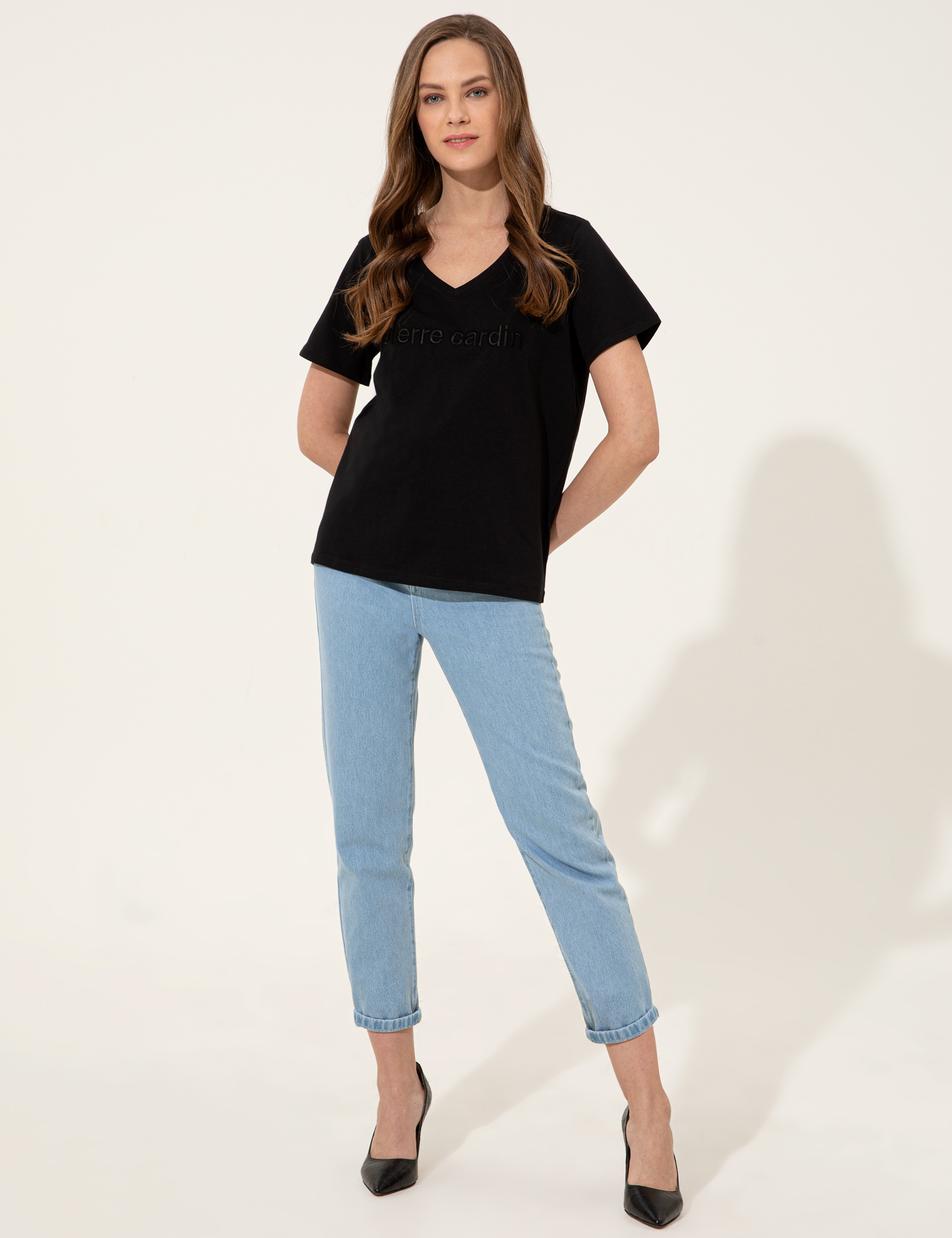 Ön kısmında Pierre Cardin dokuması bulunan v yaka kadın tişörtümüz doğal esneklik sağlayan kaliteli dokusu ile tüm dinamizminize ayak uydurur.