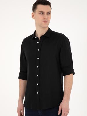 Siyah Keten Regular Fit Uzun Kollu Gömlek