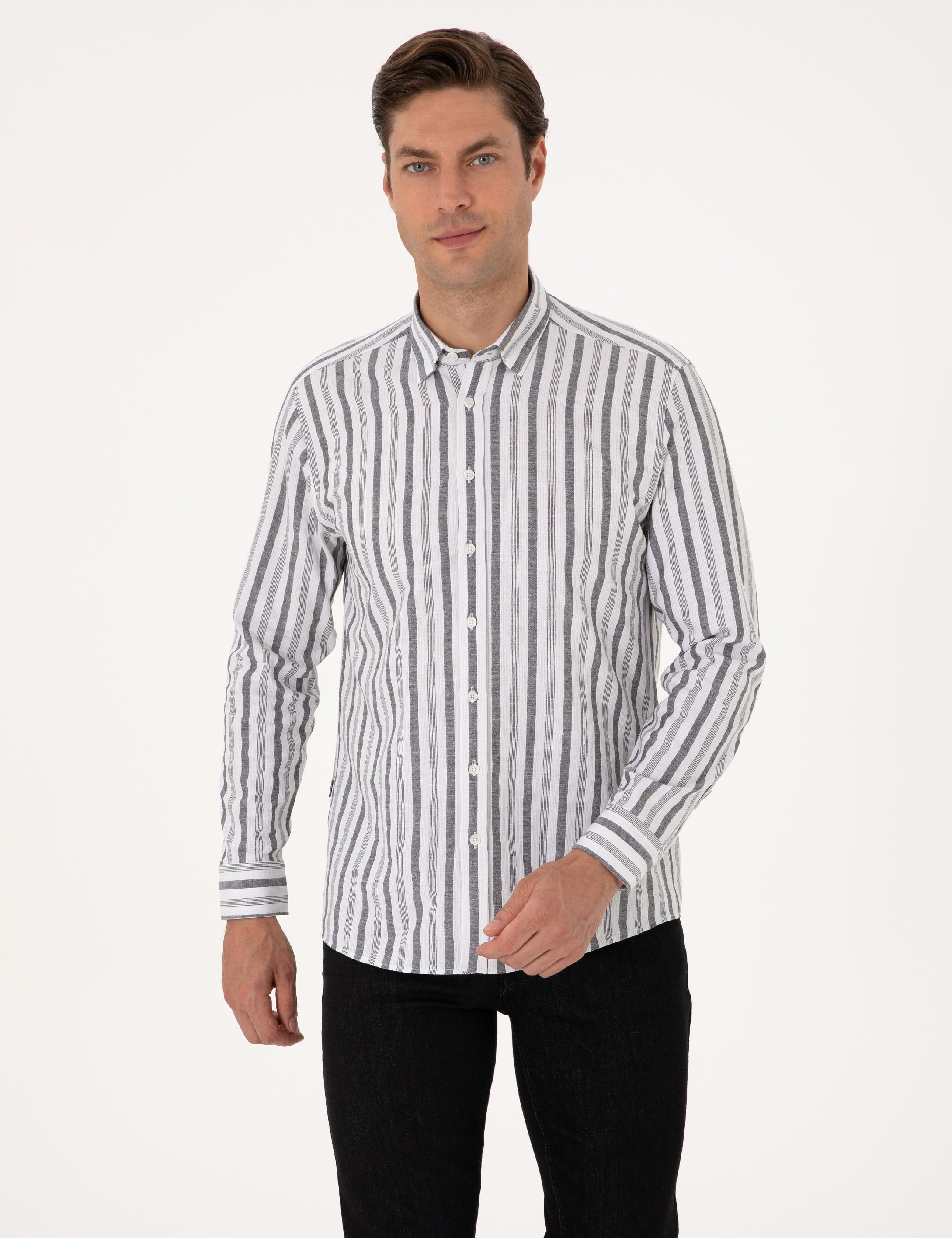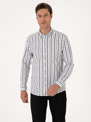 Siyah Regular Fit Çizgili Uzun Kollu Gömlek