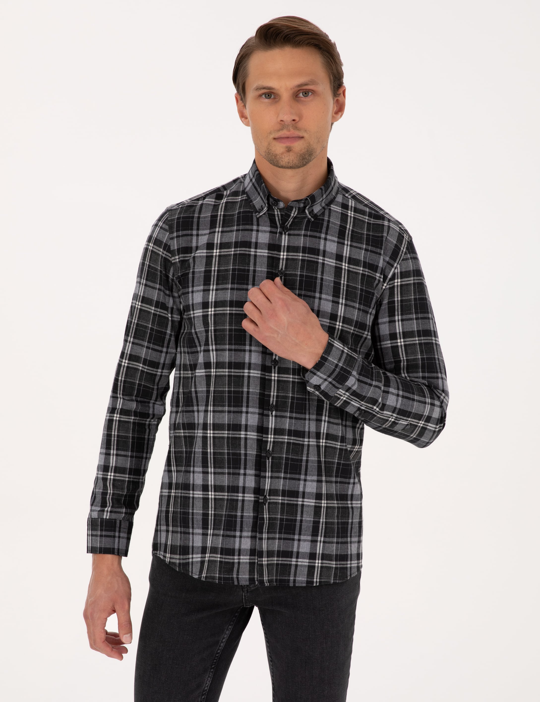 - Siyah Ekose Regular Fit Uzun Kollu Spor Gömlek