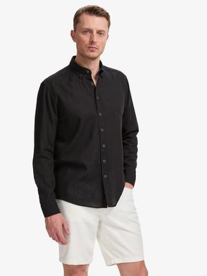 Siyah Keten Karışımlı Regular Fit Uzun Kollu Gömlek