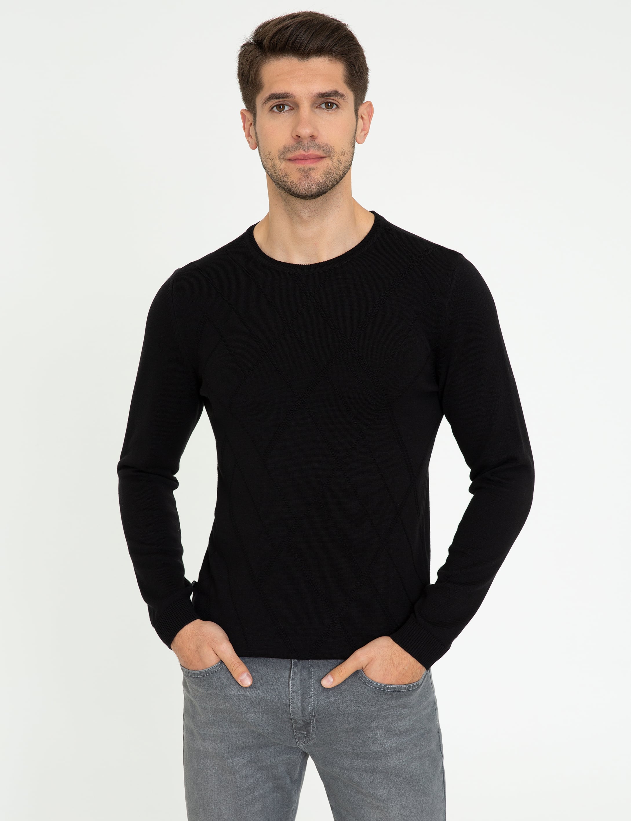 - Siyah Slim Fit Bisiklet Yaka Triko Kazak