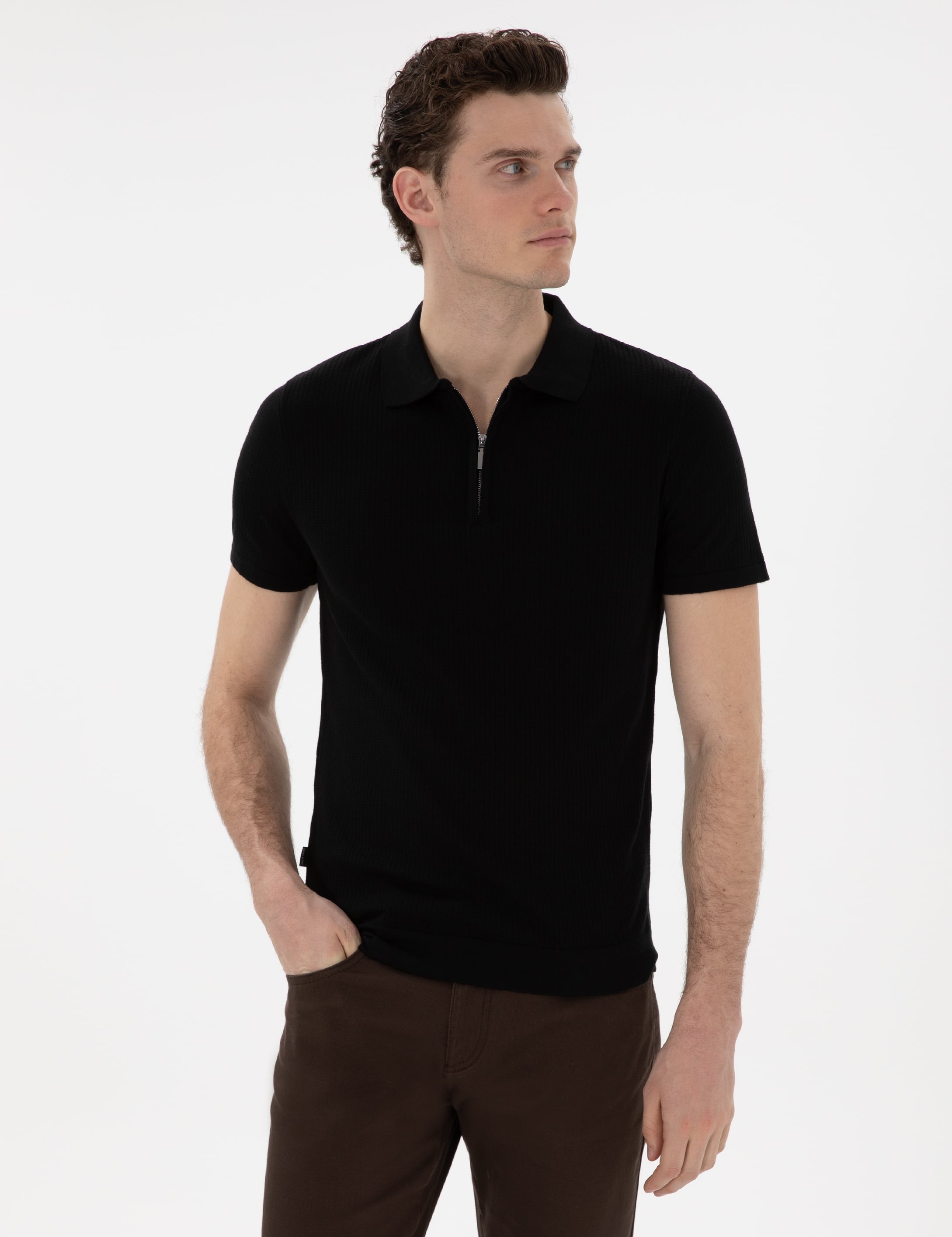 Siyah Slim Fit Fermuarlı Polo Yaka Triko Tişört